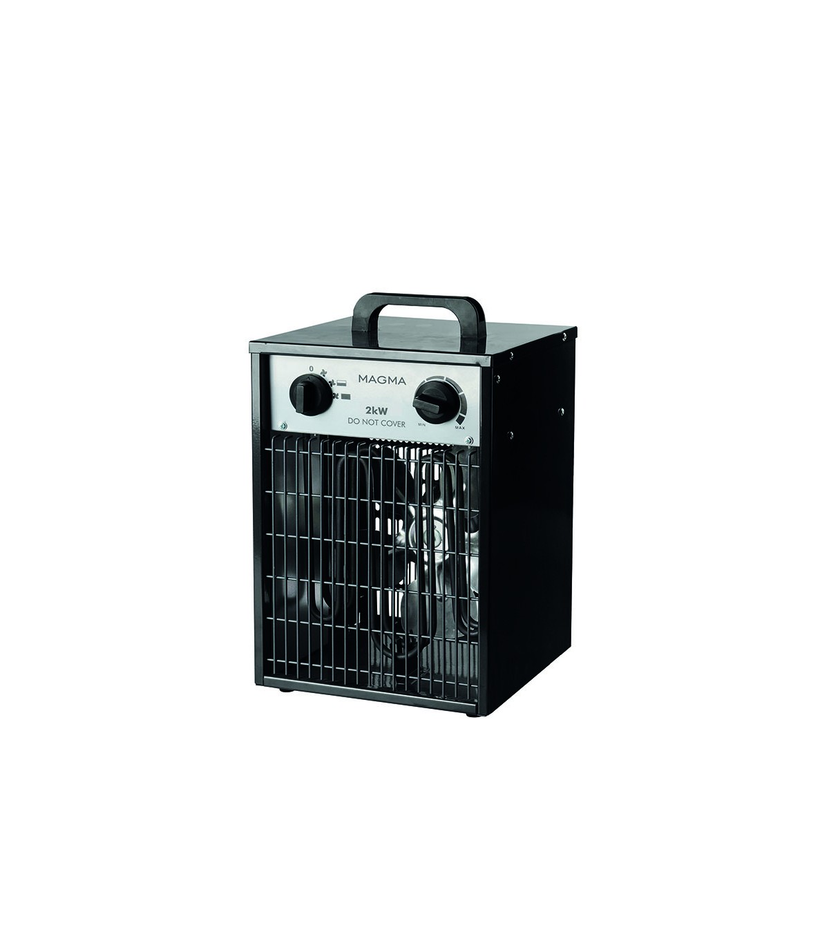 Aerotermo eléctrico industrial. Cuerpo de acero inoxidable. Función ventilación-calefacción. Termostato ajustable. Pintura resistente a altas temperaturas. Asa para transporte.