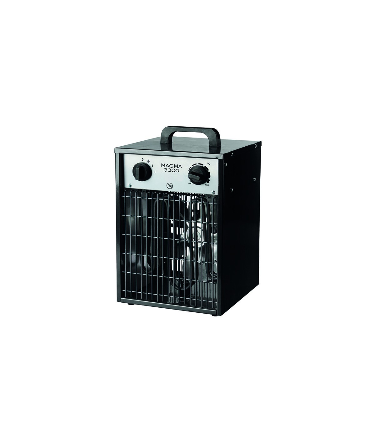 Aerotermo eléctrico industrial. Cuerpo de acero inoxidable. Función ventilación-calefacción. Termostato ajustable. Pintura resistente a altas temperaturas. Asa para transporte.