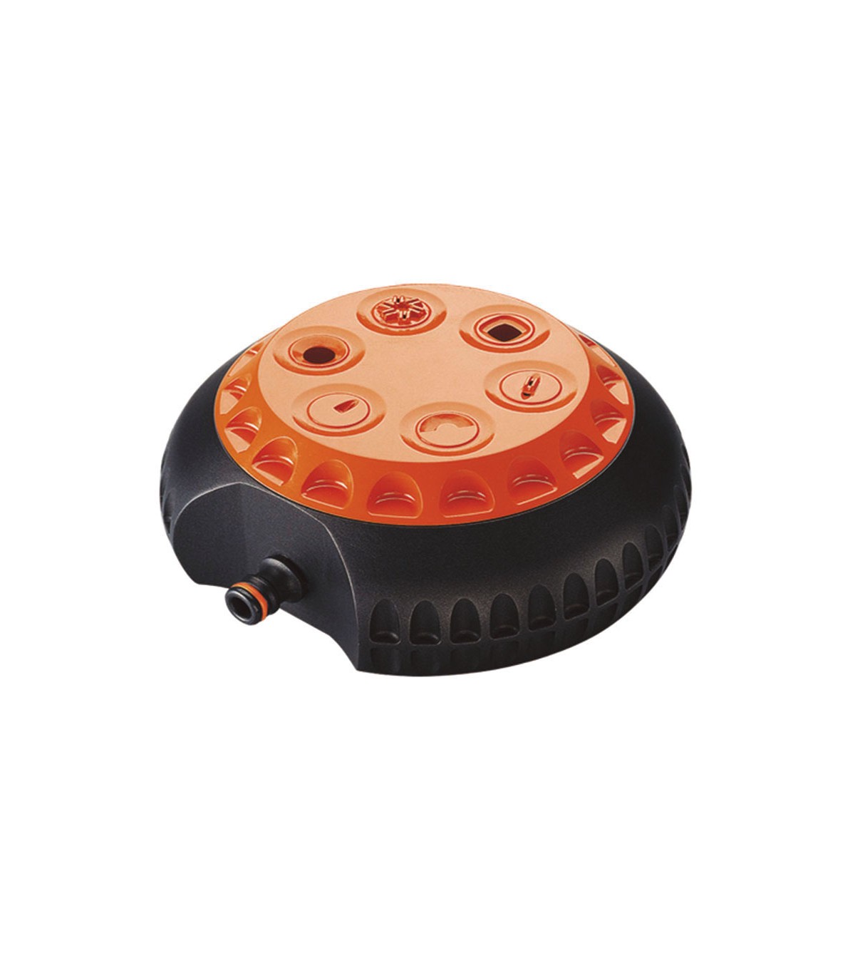 Aspersor estático, para todas las exigencias de un pequeño jardín. Listo para usar, garantiza un riego uniforme, delicado y sin estancamientos. Área regada max. 64 m².
