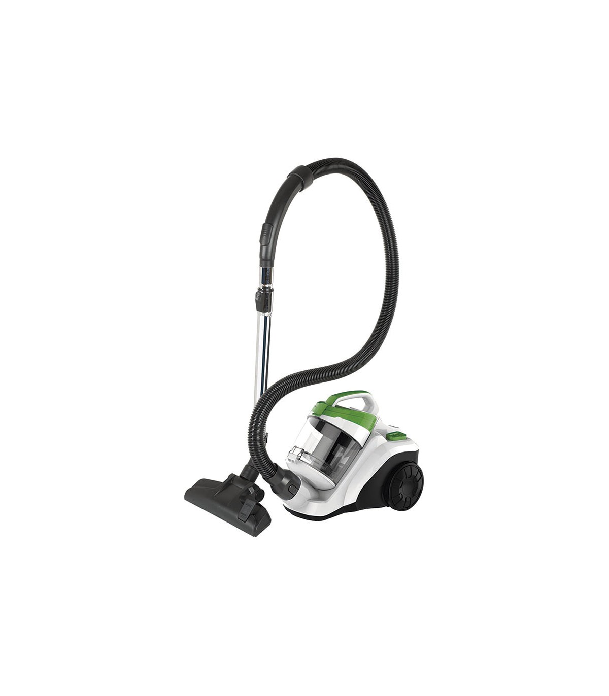 Sin bolsa. Indicador de depósito lleno. Filtro Hepa. Tubos metálicos telescópicos 48/78 cm. Manguera 1,5 m. Ruedas antideslizantes. Clasificación energética A. Boquilla 2en1: tapicerías + ranuras. Color blanco y verde.