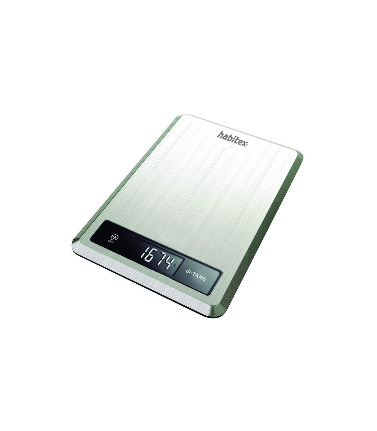 Electrónica. Plataforma extraplana de acero inox antihuella. Pantalla LCD 25x55 mm. Función tara. Indicador de sobrecarga y batería baja. Funciona con 3 baterías AAA (LR03) incluidas.