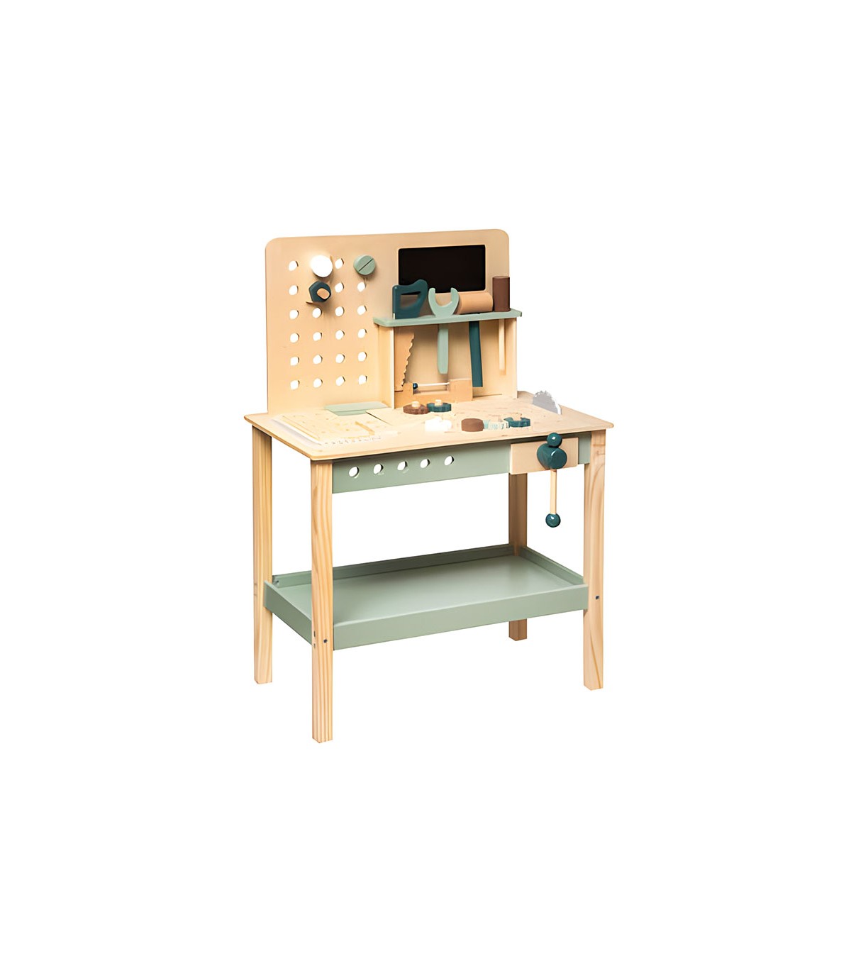 Madera combinado con madera lacada verde. Contiene todas las herramientas necesarias para ayudar a los más pequeños a hacer sus primeros trabajos de bricolaje. Ideal para niños a partir de 3 años.
