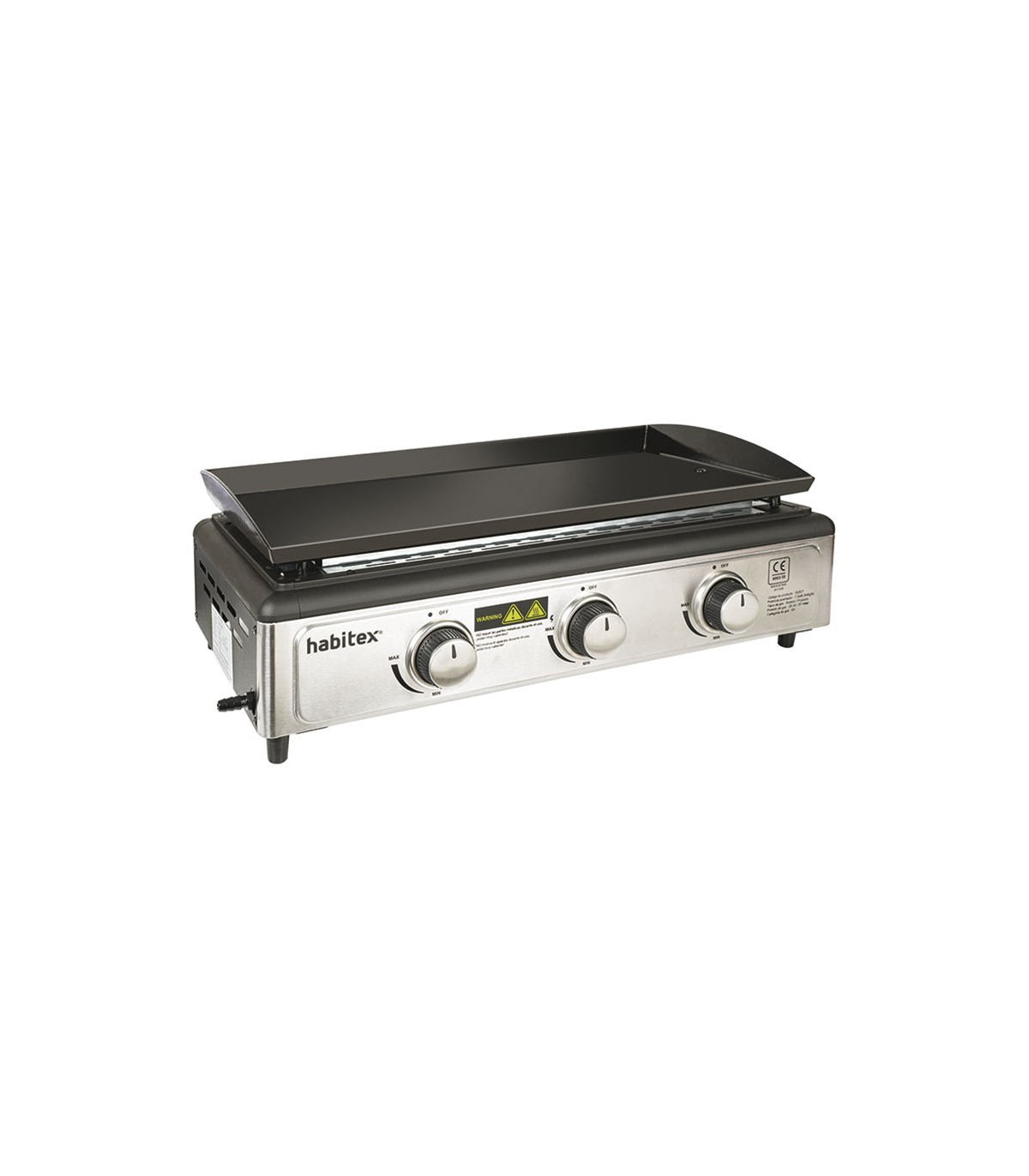Estructura metálica. Plancha de acero esmaltado. Encendido electrónico. Bandeja de recogida de grasa extraíble. Parrilla y plancha de acero esmaltado. Quemadores de acero inox. (Regulador y tubo de gas no incluido).