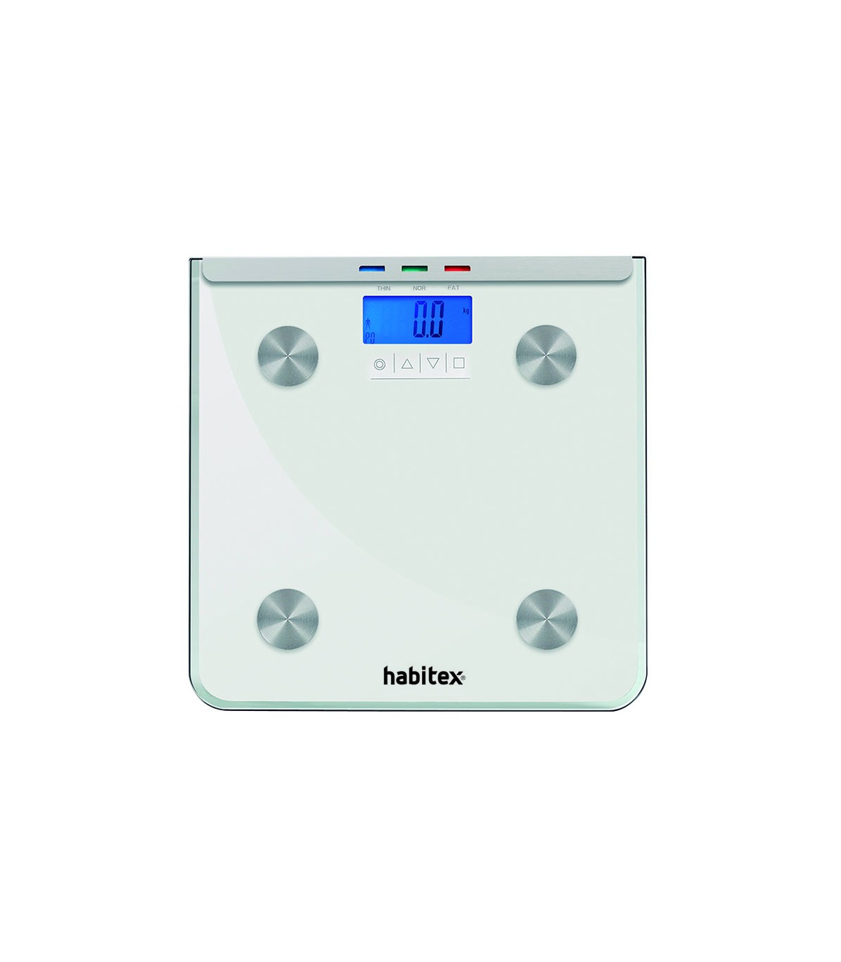 Electrónica. Plataforma de cristal templado de 6 mm. Display LCD 35x78 mm. 10 memorias. Funciones 7 en 1: pesa (kg/lb), calcula el % de grasa corporal, el % de agua, la masa muscular, kcal, la masa ósea y BMI. Desconexión automática. Indicador de sobrecarga y batería baja. Funciona con 3 x AAA (LR03) incluidas..