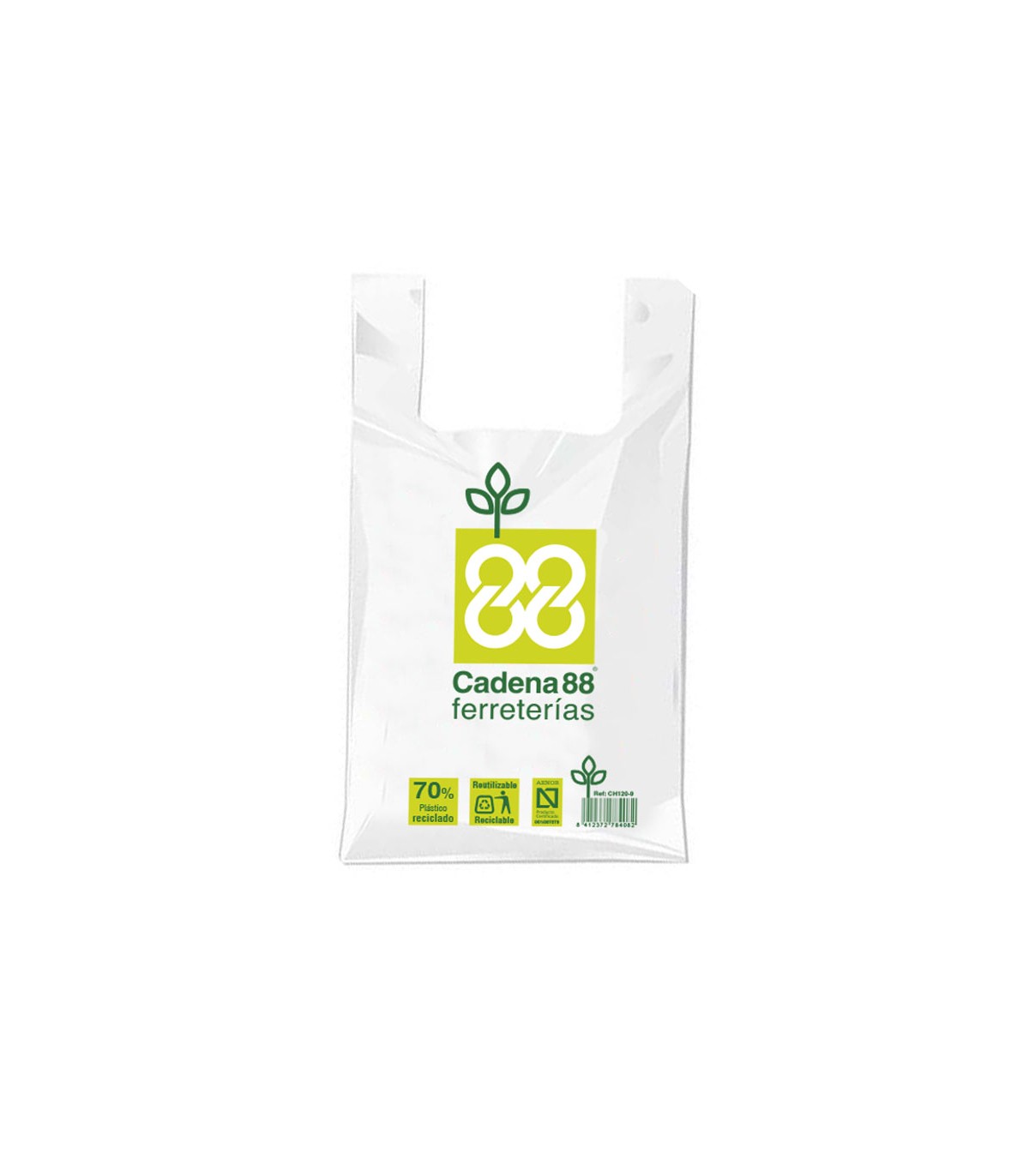 Polietileno de alta densidad 200 gr (50 micras). Fabricada con más de un 70% de material reciclado. Reutilizable. Impresa con tintas ecológicas al agua. Cumple Norma AENOR UNE 53930-2 para uso de bolsas de distribución, de obligatorio cumplimiento a partir de 2021..