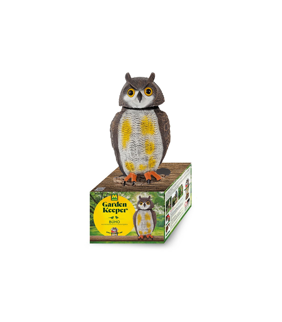 Búho eólico fabricado en PVC. Dispone de un mecanismo interior que mueve la cabeza gracias a la acción del viento. Protege balcones, jardines frutales, embarcaciones, etc.