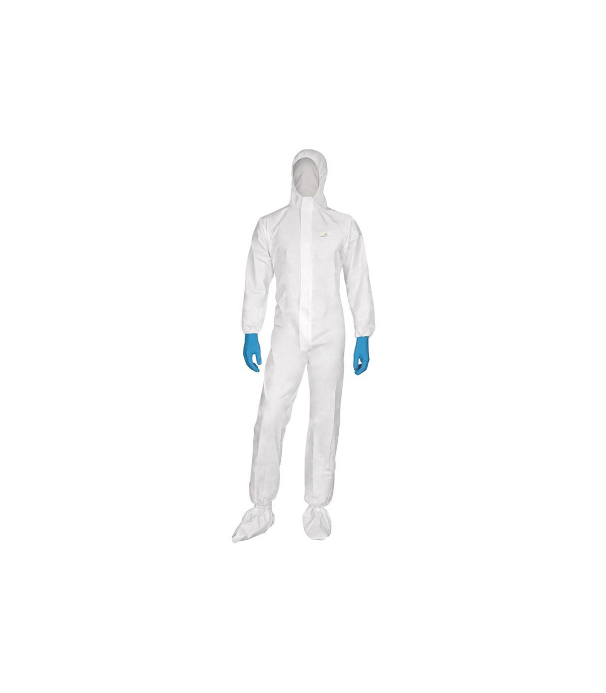 Con capucha elástica, no tejido microporoso laminado 60 gr/m². Cierre por cremallera bajo solapa. Elástico de ajuste en cabeza, cintura, puños y tobillos. Antiestático. Riesgo químico 5 y 6. Protección biológica. EN13688:2013, EN 13982-1:2004+A1:2010, EN13034:2005+A1:2009, EN1149-5:2008.