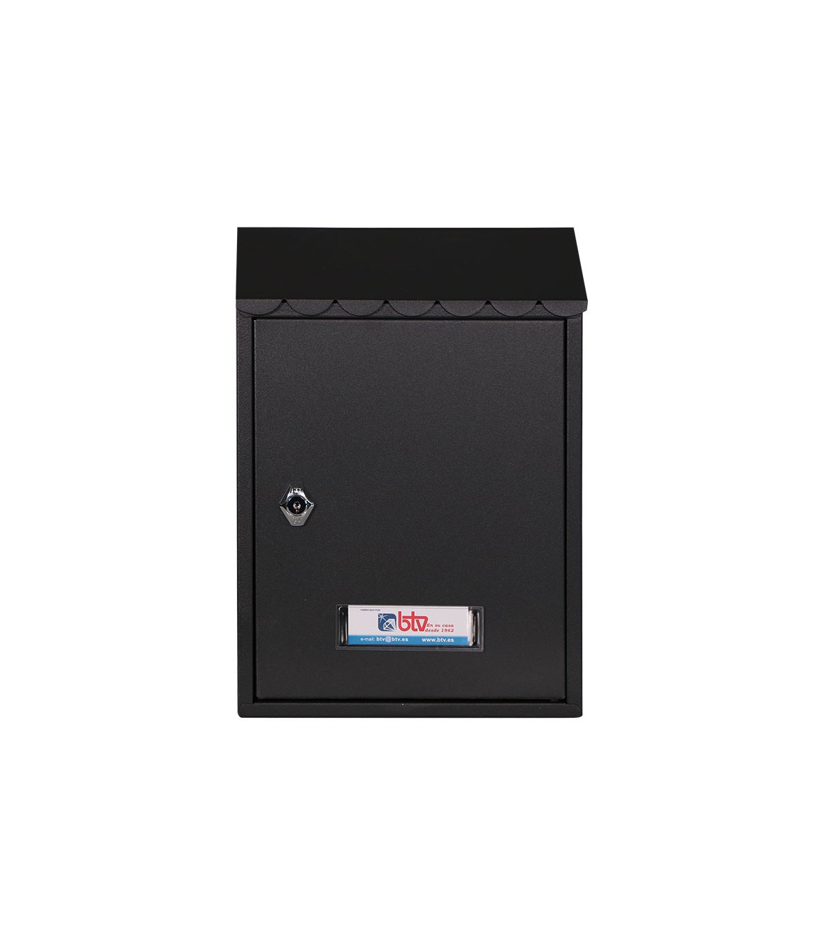 Acero galvanizado pintado. Disponible en color blanco y negro. Con tejadillo decorativo. Cerradura de rombo. Dimensiones: 21x6,8xh.30 cm.