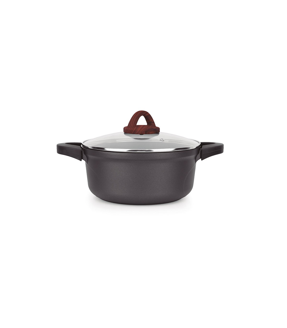 Aluminio fundido indeformable 6 mm. Antiadherente 3 capas libre PFOA. Mango baquelita efecto nogal acabado soft touch. Fondo difusor con base ferrítica "full induction". Para todo tipo de cocinas. todas las cacerolas incluyen asas de silicona en ollas y cacerolas.