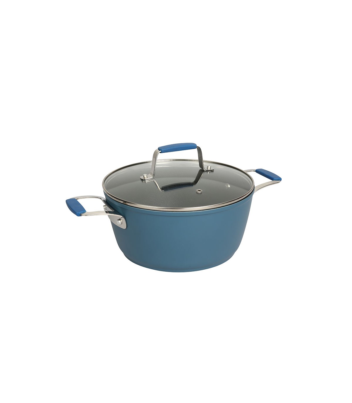 Aluminio forjado. Cuerpo 2,2 mm. Fondo 3,5 mm. Interior antiadherente de 2 capas Xylan Plus, libre PFOA. Fondo difusor con base ferrítica full induction para todo tipo de cocinas. Mangos y asas remachados acabado soft-touch. Exterior lacado azul.