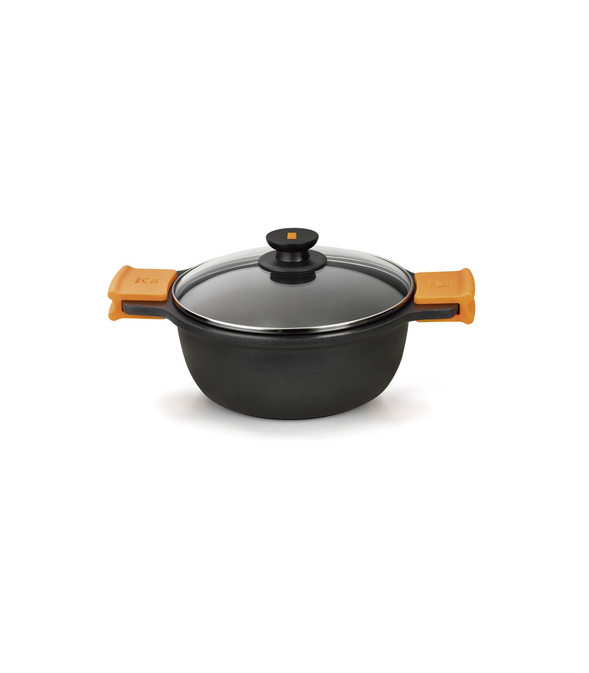Aluminio fundido. 6 mm de espesor de base. Revestimiento tricapa antiadherente de Teflón Platinum Plus 100% libre PFOA. Cacerolas con tapa y asas de silicona termoresistentes y desmontables. Aptas para todo tipo de cocinas.