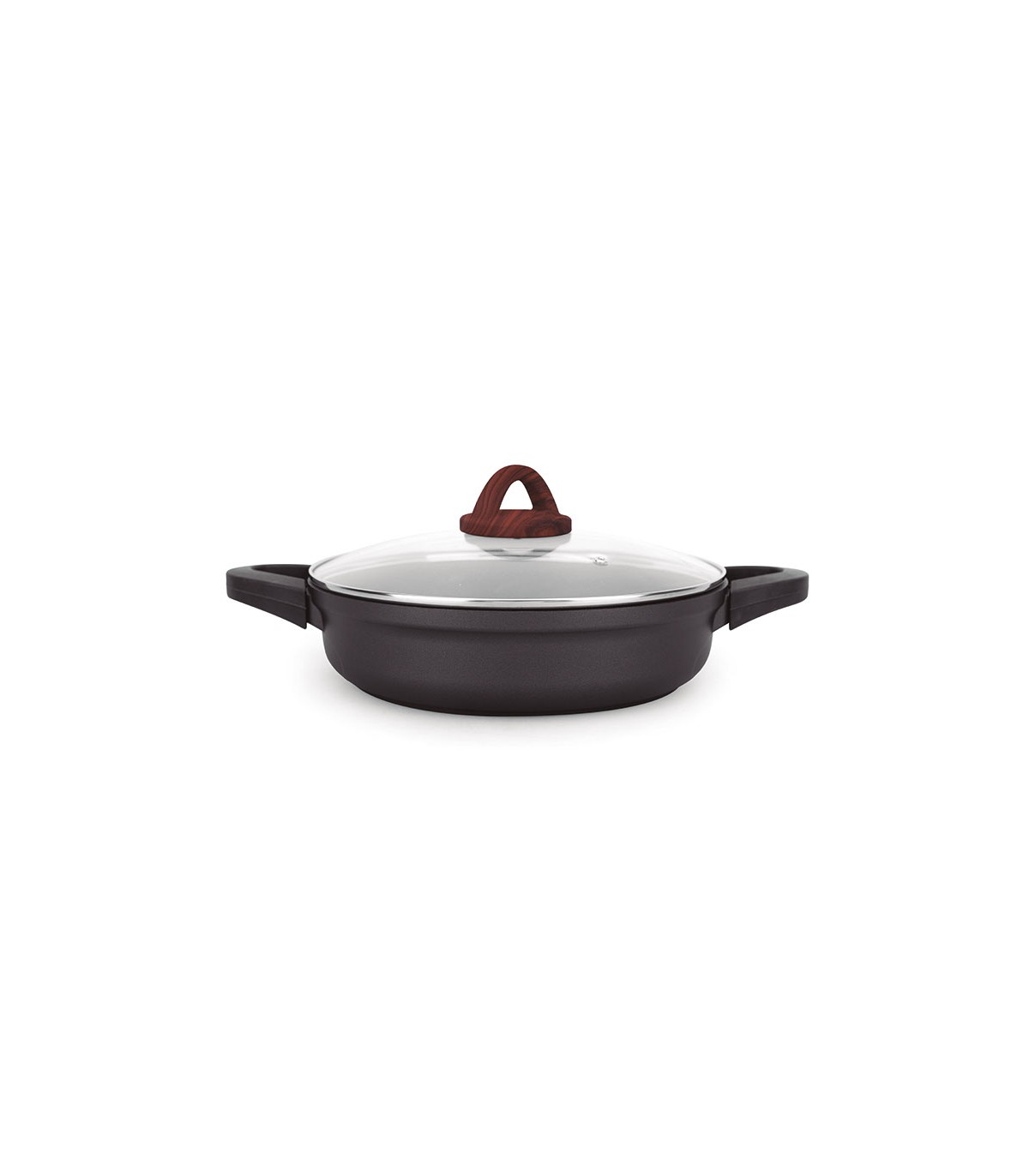 Aluminio fundido indeformable 6 mm. Antiadherente 3 capas libre PFOA. Mango baquelita efecto nogal acabado soft touch. Fondo difusor con base ferrítica "full induction". Para todo tipo de cocinas. todas las cacerolas incluyen asas de silicona en ollas y cacerolas.
