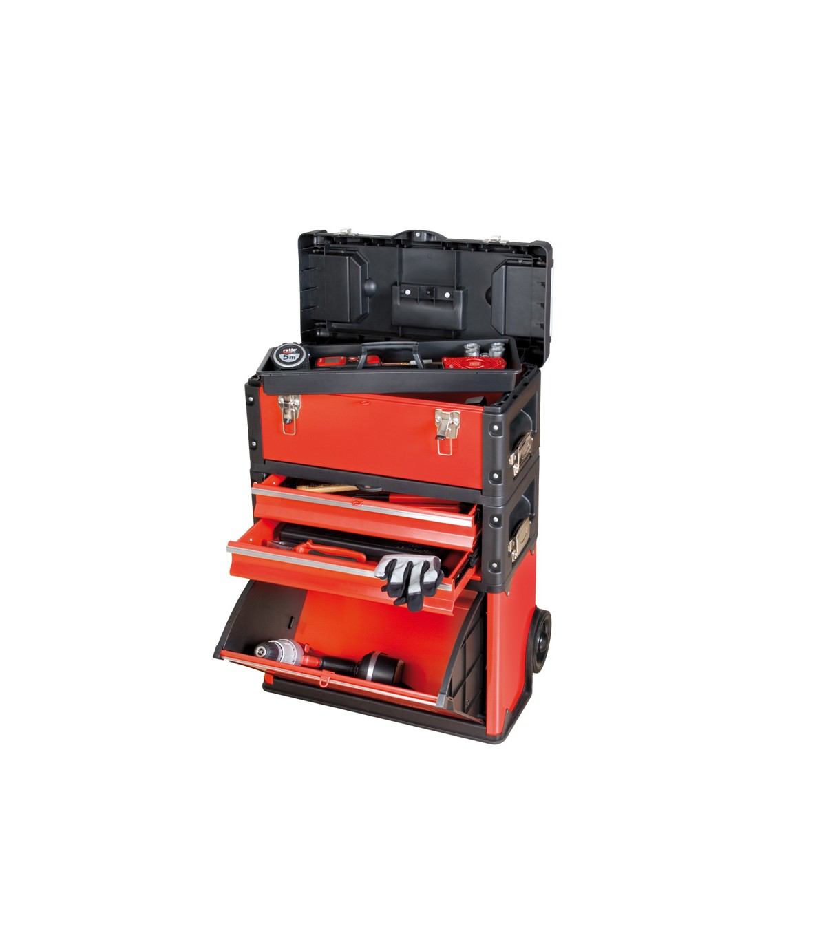 Sistema modular. Estructura robusta de plástico y chapa metálica. 2 cajones con guías metálicas y bolas de rodamientos. Ruedas reforzadas ø 125 mm. Cierres metálicos. Incluye bandeja. Fácil acceso al gran contenedor inferior. Separable en 3 módulos. Mango telescópico aluminio 100 cm. Incluye 2 cajas multiusos separables.