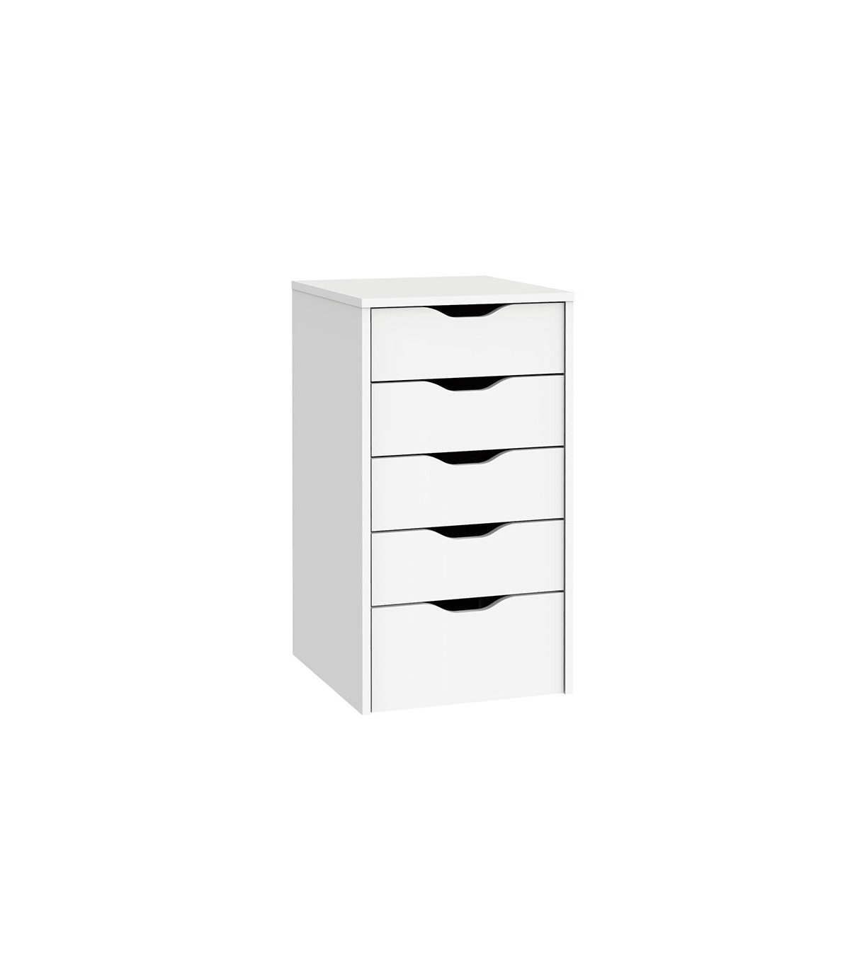 Aglomerado de partículas y melamina de alta densidad. 5 cajones con guías metálicas.. Interior acabado textil. Cajón inferior más grande. Mueble kit para montaje.