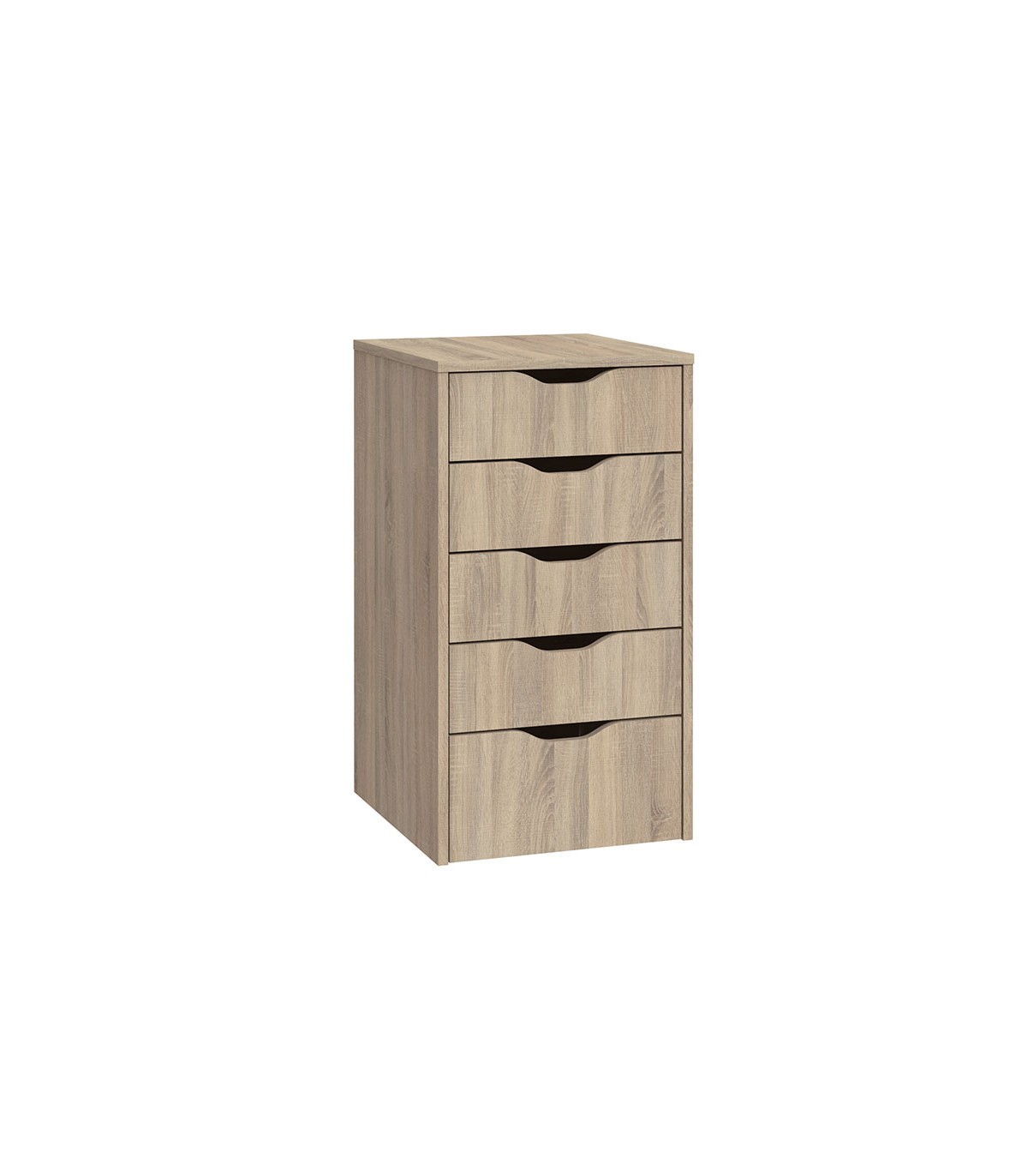 Aglomerado de partículas y melamina de alta densidad. 5 cajones con guías metálicas.. Interior acabado textil. Cajón inferior más grande. Mueble kit para montaje.