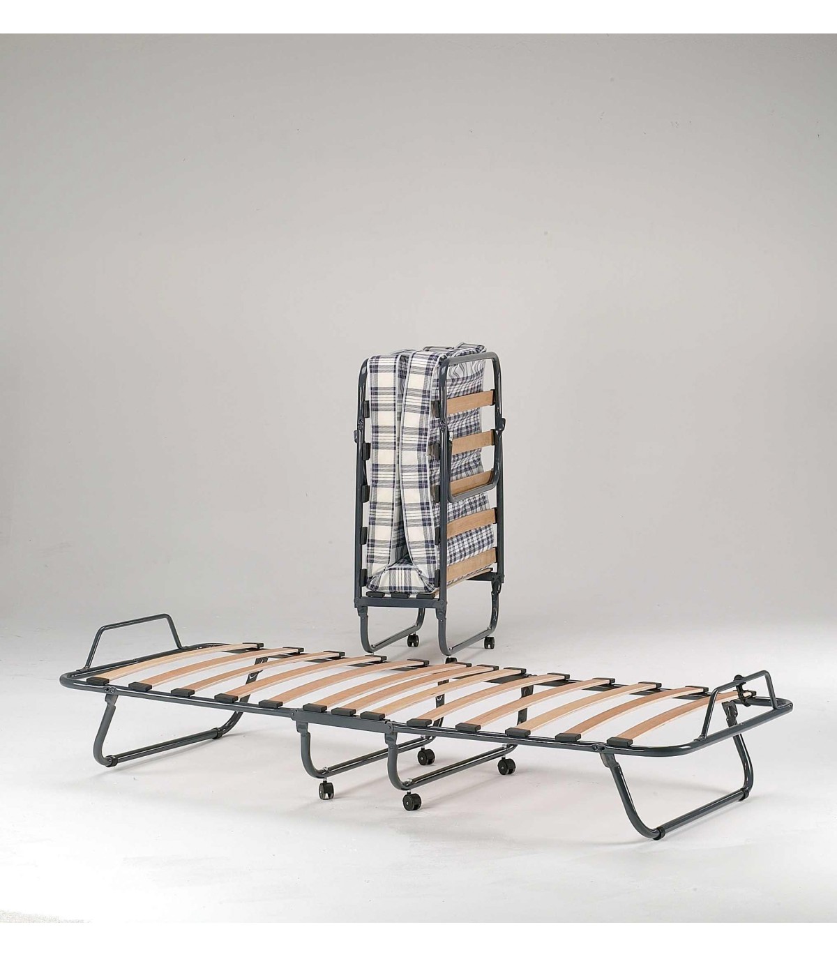 Colchón 10 cm de grosor con funda estampada. Láminas madera de haya. Ruedas de transporte. Abierto: 190x80xh.27 cm. Cerrado: 80x30xh.105 cm.