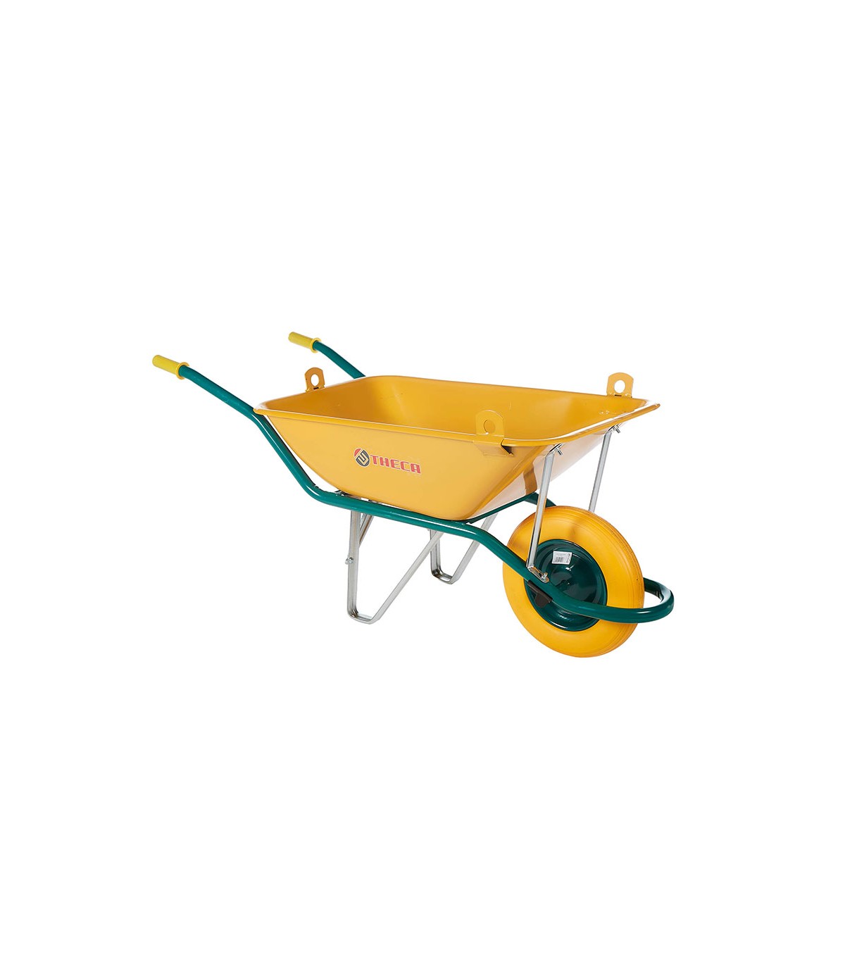 Bandeja redondeada. Pintura epoxy amarilla. 90 l. en líquidos. 110 l. en sólidos. Rueda sobre llanta de acero. Usos: Construcción, jardinería, horticultura. Medidas: 140x60x60 cm. Se sirven en pallet de 20 unid.