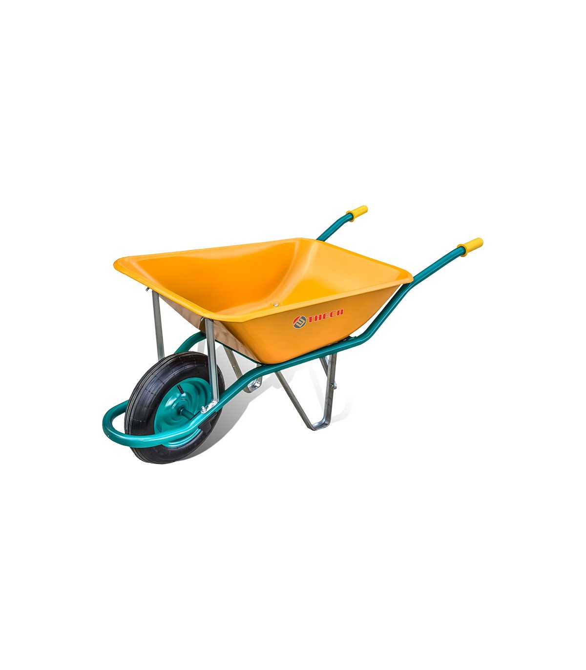 Bandeja redondeada. Pintura epoxy amarilla. 90 l. en líquidos. 110 l. en sólidos. Rueda sobre llanta de acero. Usos: Construcción, jardinería, horticultura. Medidas: 140x60x60 cm.