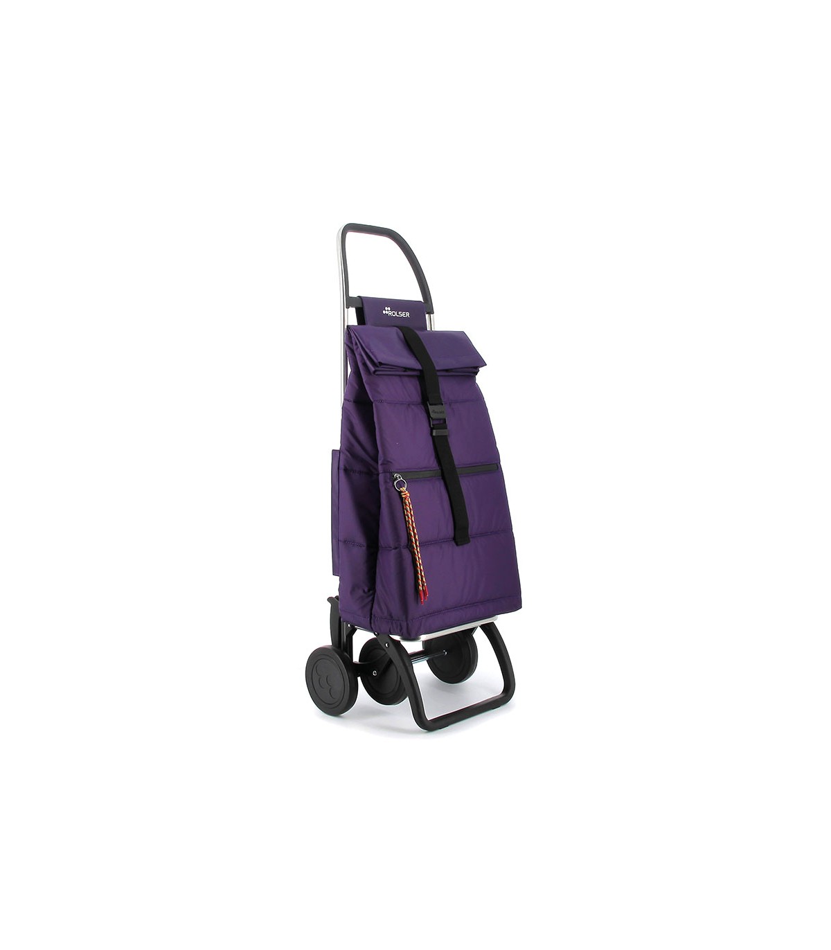 4 ruedas. Base inferior abatible. Apoyo delantero. Gran capacidad. Plegado, ocupa el mínimo espacio. Bolsillo delantero.