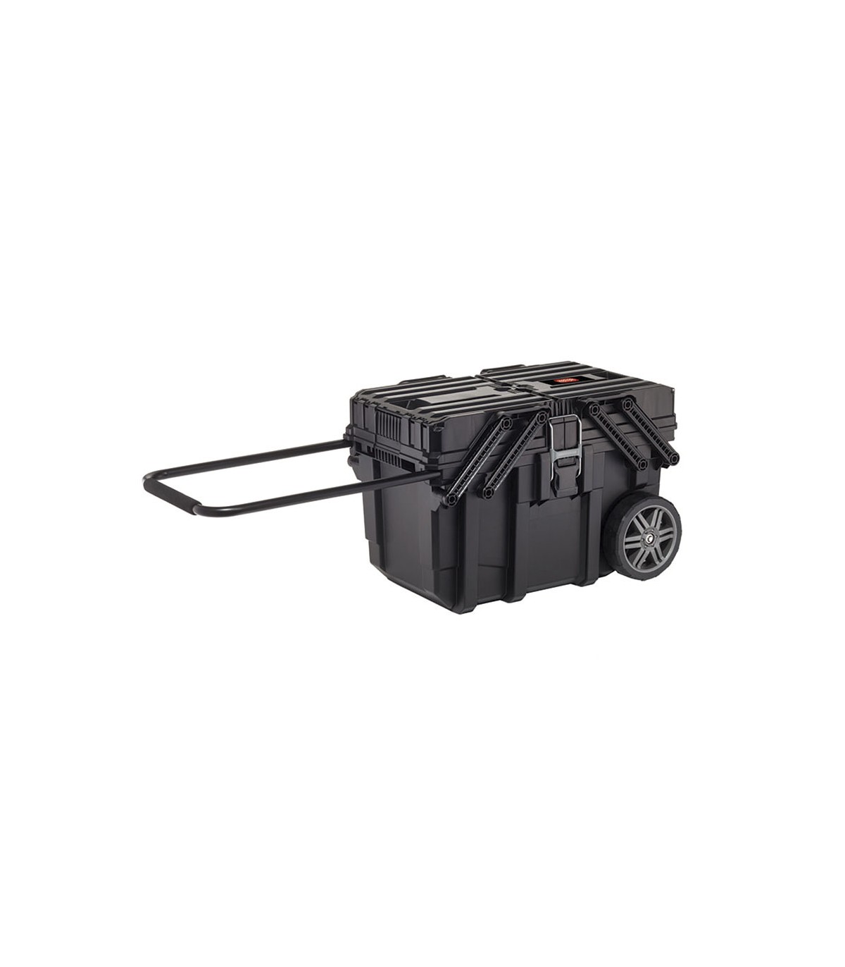 57 l. Sistema apertura cantilever para fácil distribución de contenido. Asa metálica con empuñadura de goma. Cierres metálicos. Resistente al agua y polvo. Ruedas goma ø 7". 8 compartimentos con separadores incluidos.