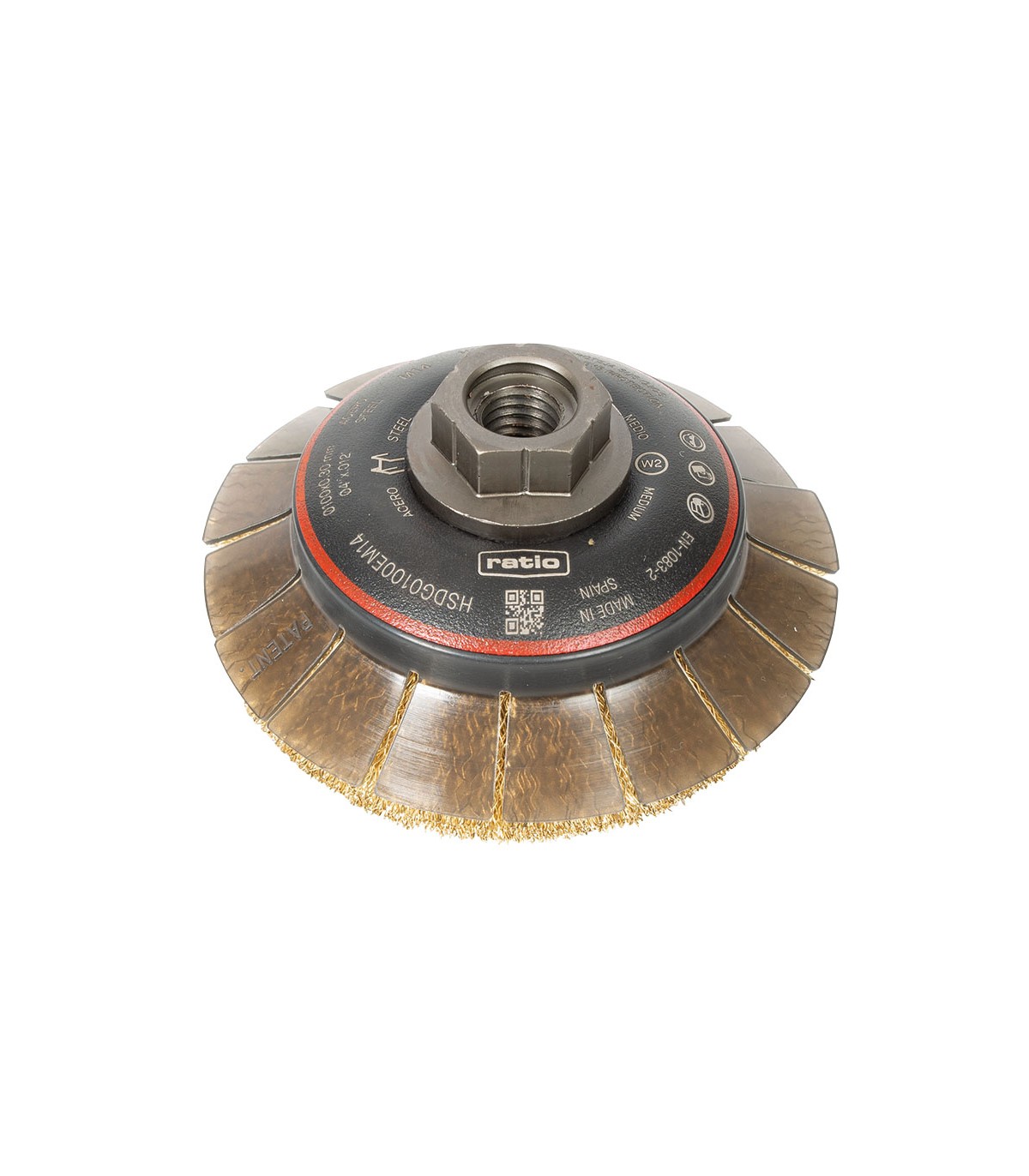 Alambre ondulado. Acero latonado. Casquillo roscado M14. Para óxidos, pinturas y adherencias. Diseñado para mini-amoladoras.