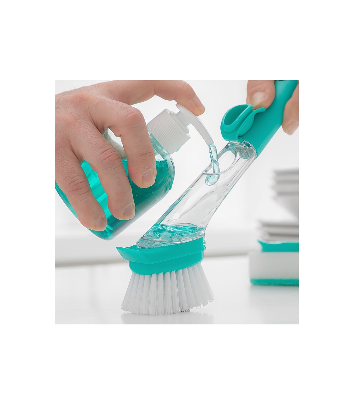 ABS-nilón. Mango con depósito 50 ml para rellenar con jabón lavavajillas. Botón dispensador. Accesorios intercambiables: 1 cepillo para suciedad incrustada, 3 estropajos para suciedad normal.
