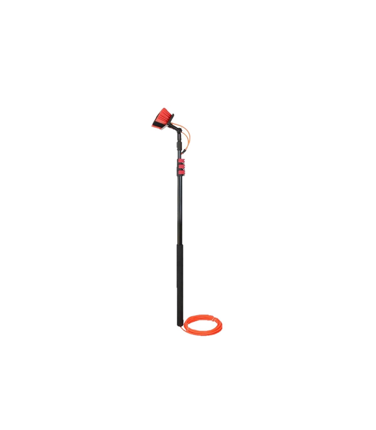 Cabezal pivotante adaptable. Mango telescópico de aluminio. Versátil y ergonómico. Se puede conectar a un grupo de presión con su manguera de goma con válvula de cierre. Dispensador de jabón con botón dosificador. Múltiples aplicaciones.