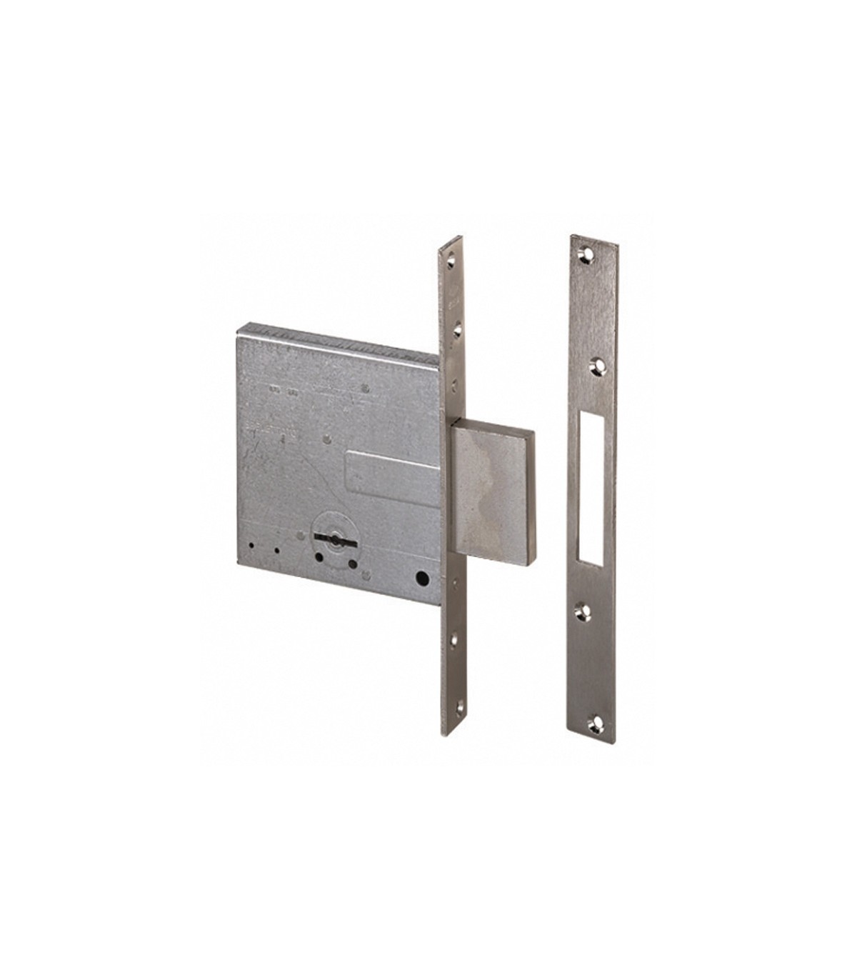 Cuatro vueltas con palanca. Frente y cerradero de acero satinado niquelado. Caja y palanca de acero. Frente de acero inox. Picaporte y palanca niquelados.
