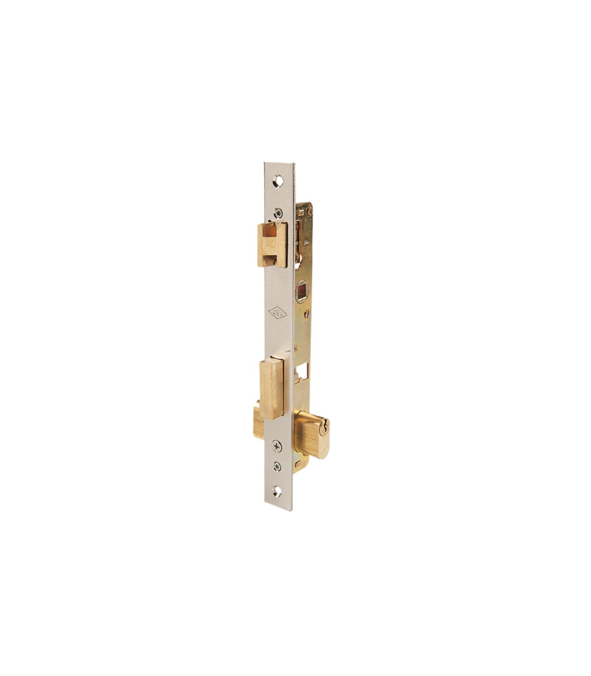 Picaporte reversible de latón accionado por llave, palanca deslizante. Cilindro ovalado (5963). Frente niquelado.