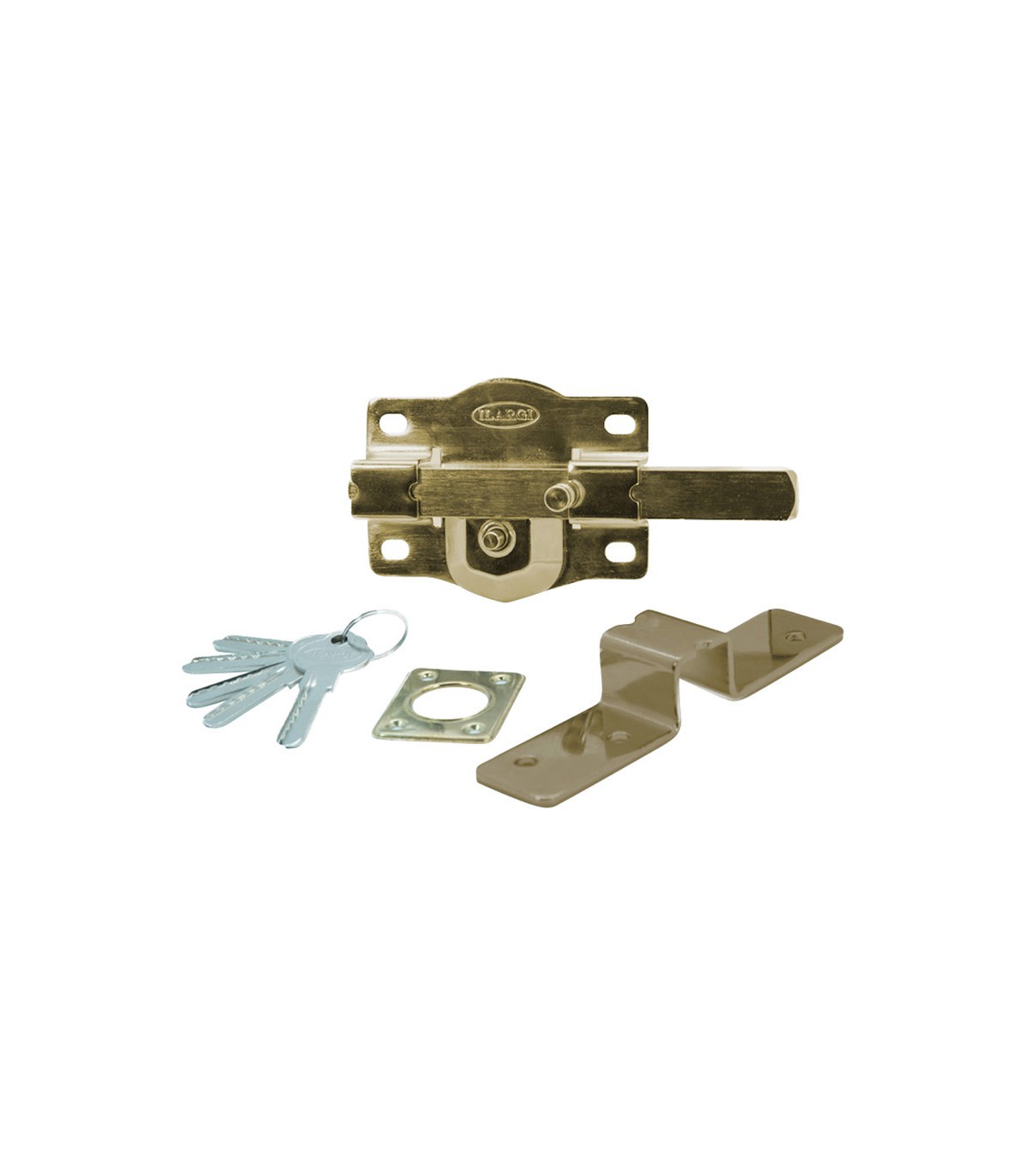 Cilindro exterior de seguridad y botón interior. Barra de acero calibrado de 18 mm. Placa en acero 2 mm. Cerradero en acero de 3 mm. Caja de 105 mm. Acabado en hierro esmaltado de alta resistencia. Incluye 5 llaves.