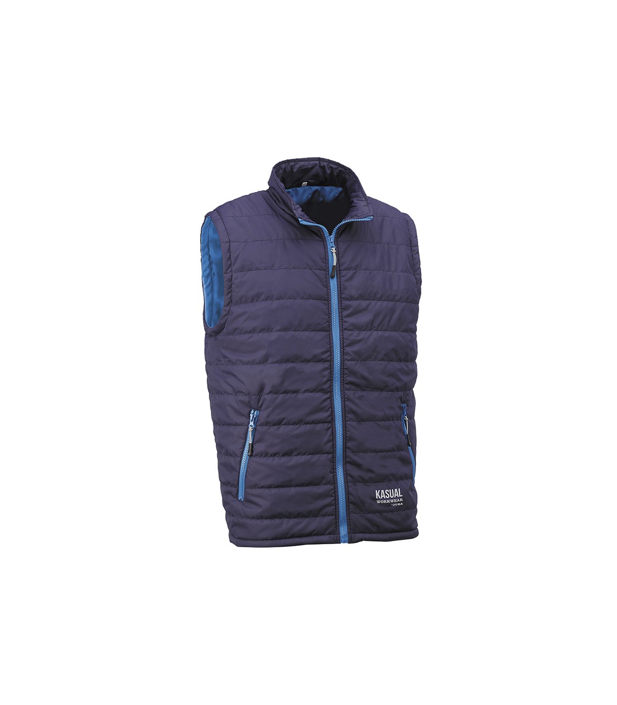 Chaleco acolchado con cierre frontal de cremallera. Dispone de 2 bolsillos exteriores con cierre de cremallera. 100% poliéster. Color azul marino.