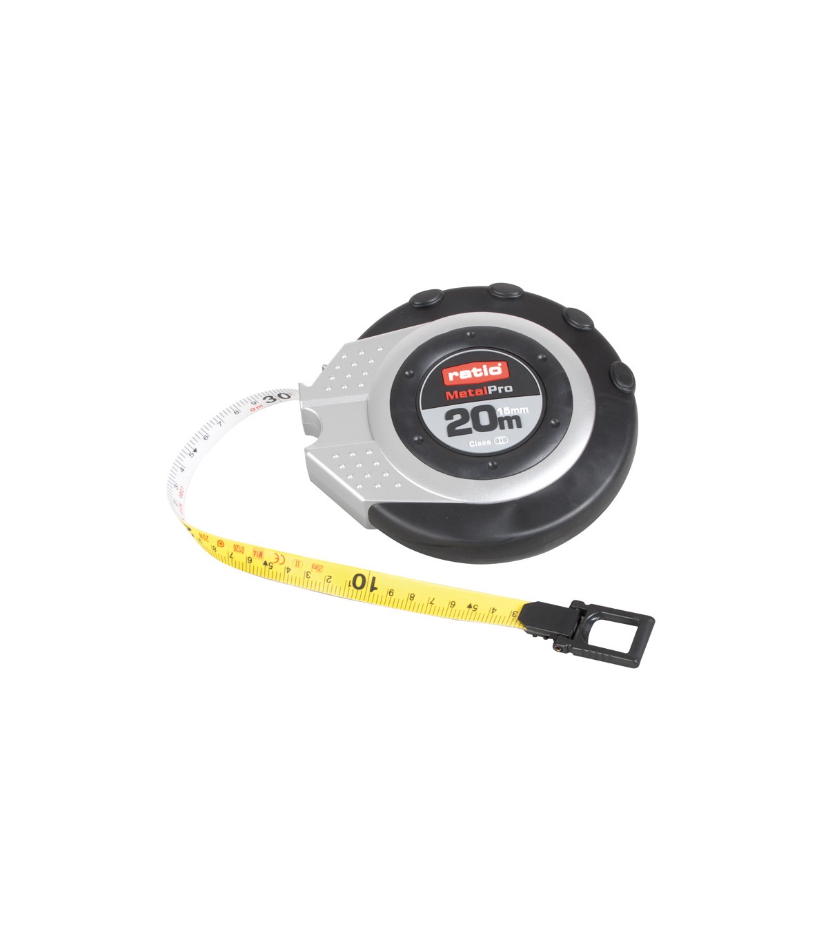 Cuerpo ABS con recubrimiento antideslizante. Cinta bicolor con numeración doble cara. Con revestimiento antireflex. Rebobinado 3 veces más rápido. Homologación CE. Clase de precisión II.