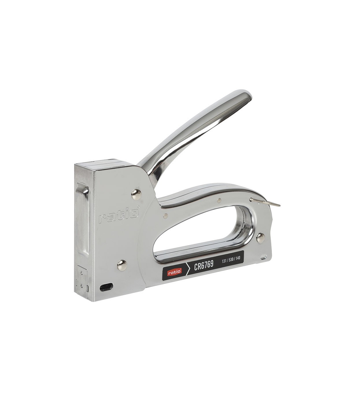 Carcasa y mecánica en acero. Acabado cromado duradero. Ventana con visor de grapas. Bloqueo del mango para mayor seguridad. Carga inferior para facilitar la carga de grapas. Inlcuye 150 grapas. surtidas.