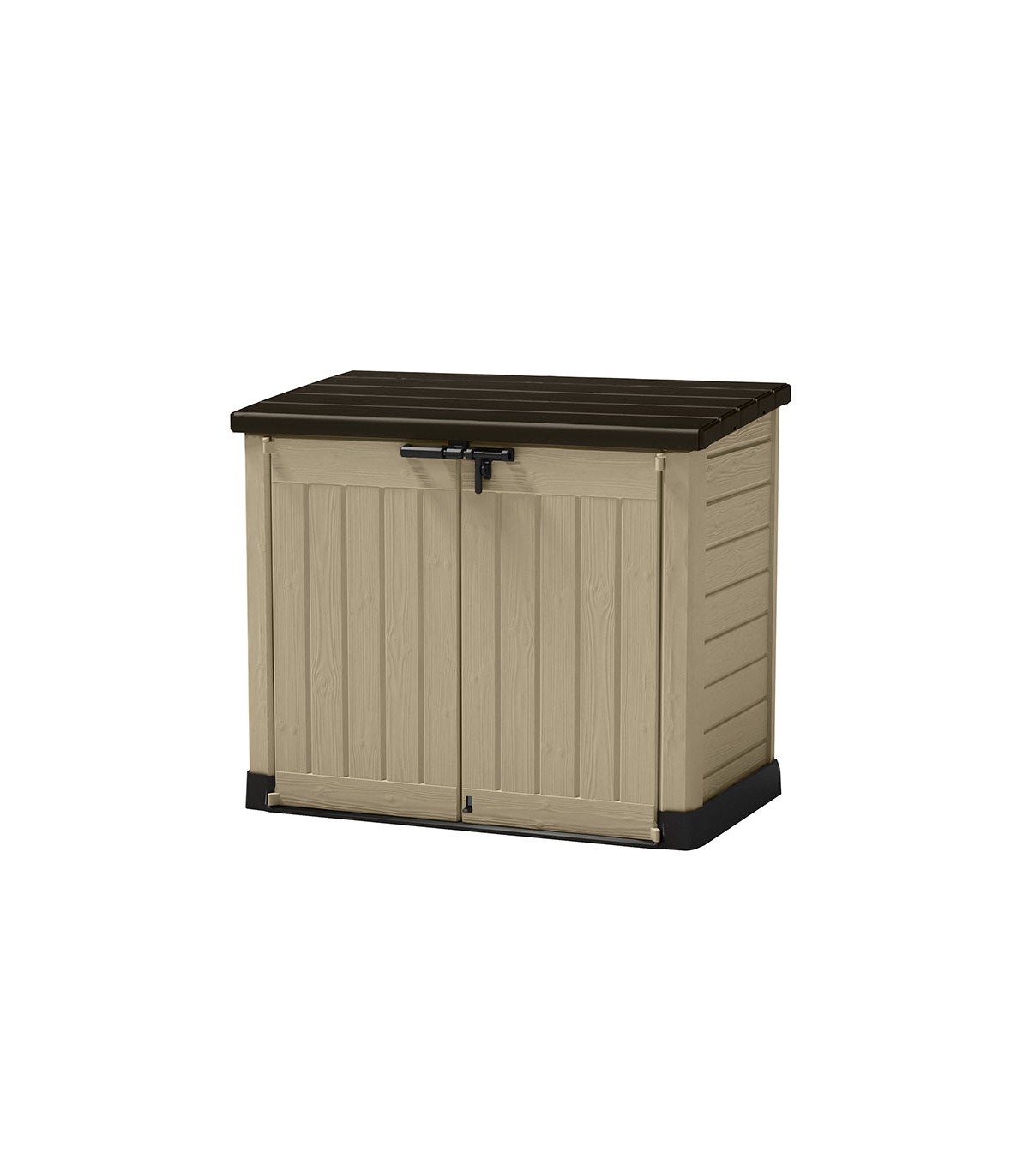 Para interior o exterior. Polipropileno inyectado gran resistencia. Hasta 1.200 litros. Dispone rejilla ventilación. Incluye suelo. Dispone pistones metálicos para abrir y cerrar fácilmente. Posibilidad cierre con candado. Color beige.