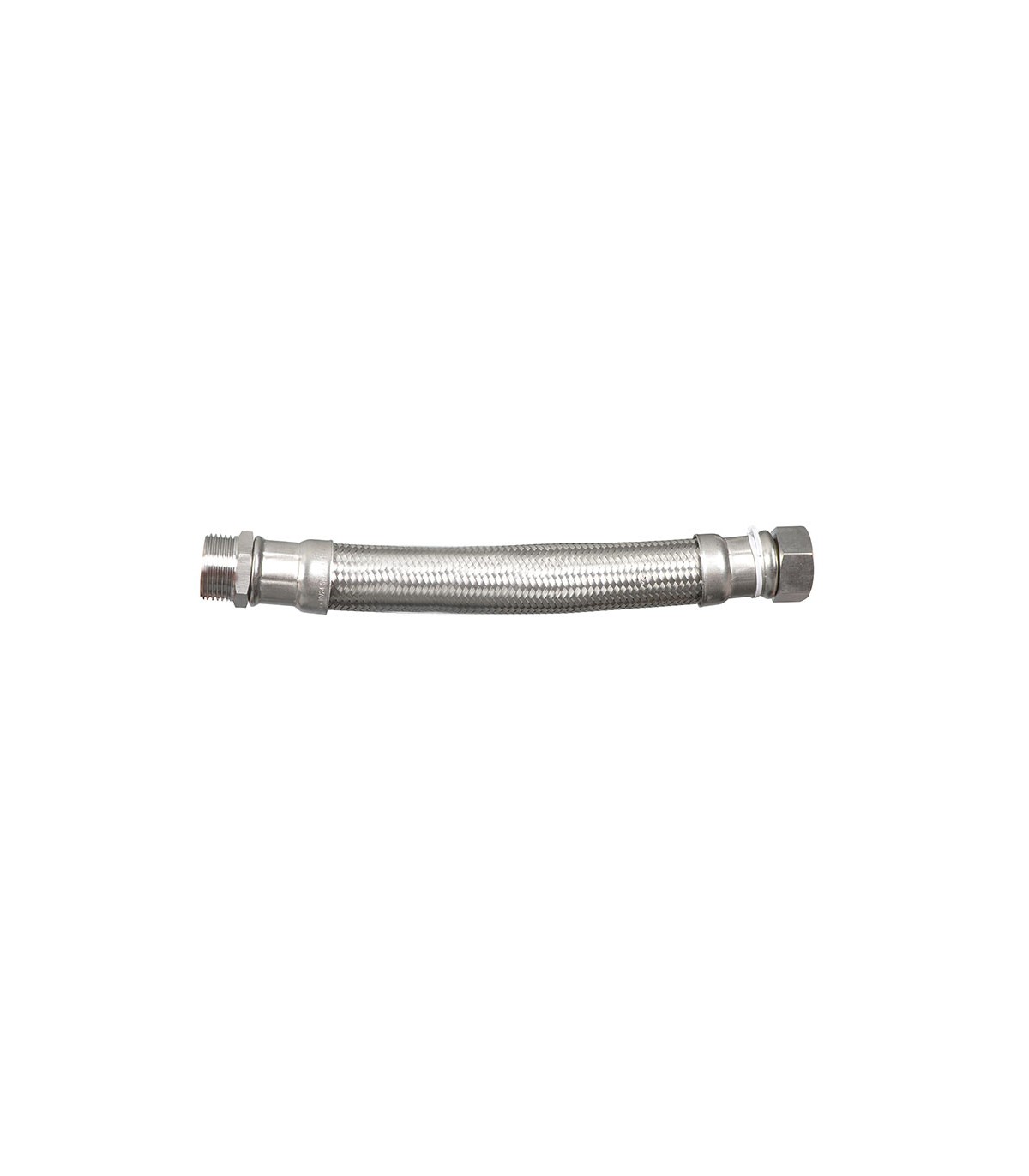 (Latiguillo). Tubo caucho sintético, trenzado con hilos de acero inox. Racor latón niquelado ø 25 mm.