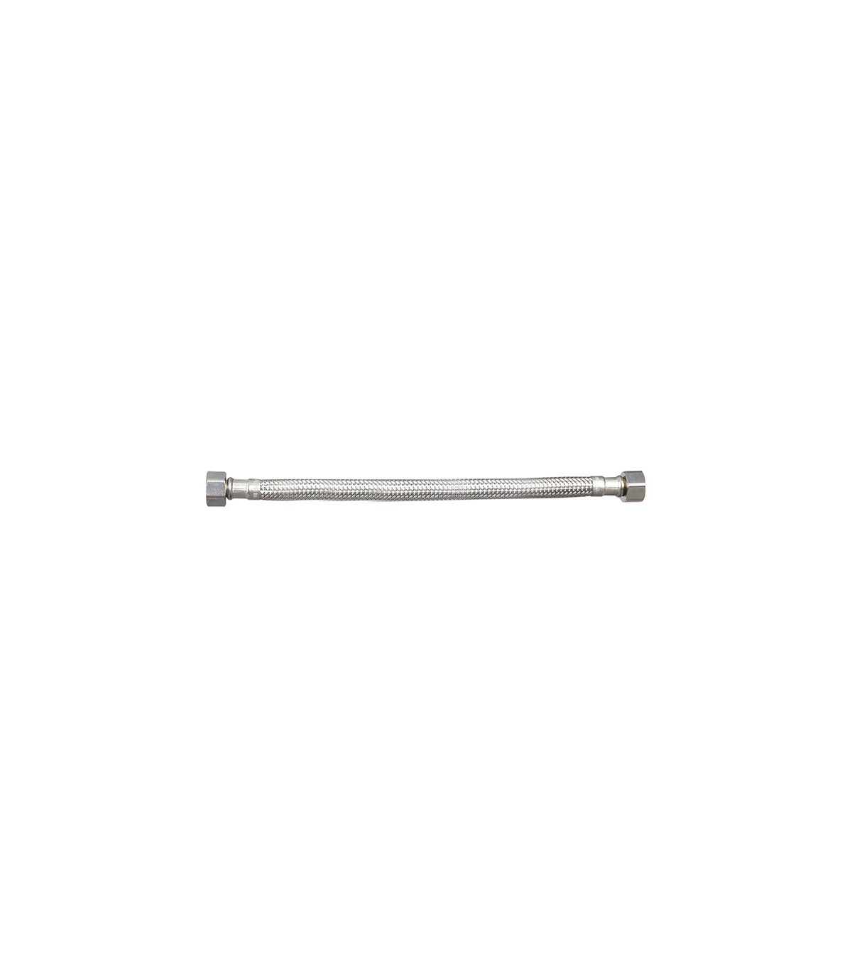 (Latiguillo). Tubo caucho sintético, trenzado con hilos de acero inox. Racor latón niquelado ø 8 mm.