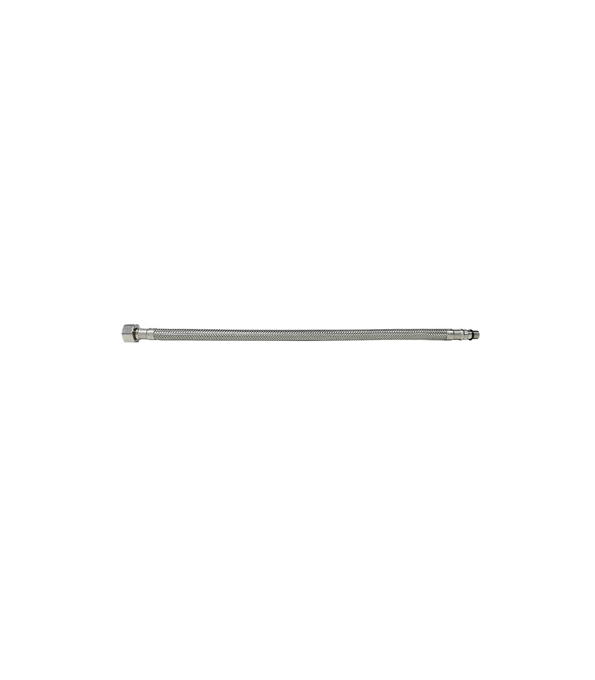 (Latiguillo). Tubo caucho sintético, trenzado con hilos de acero inox. Racor latón niquelado ø 8 mm.