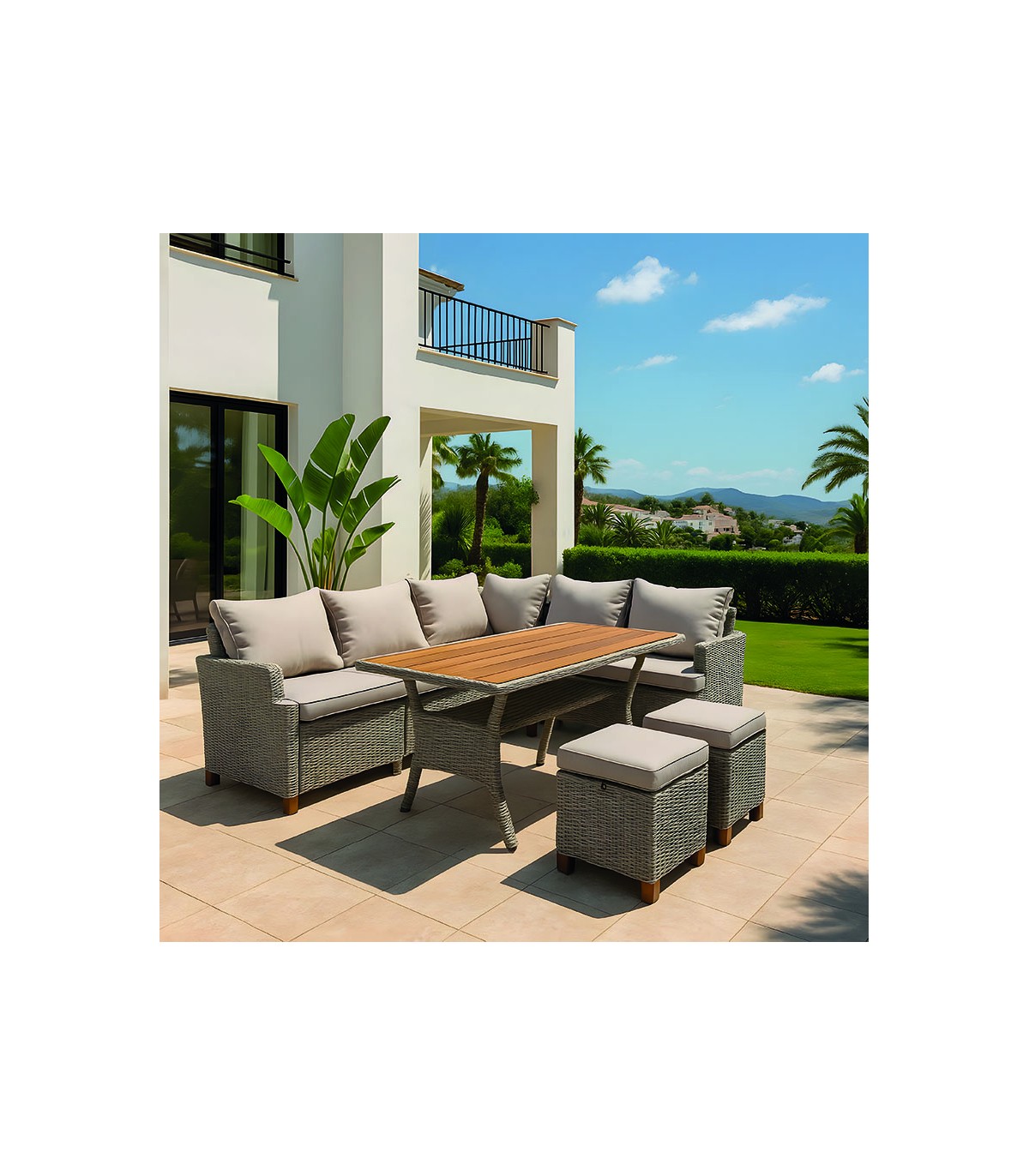 Ratán sintético. Color gris. Tipo tela poliéster gris claro. Cojines desenfundables. Tope mesa acacia.