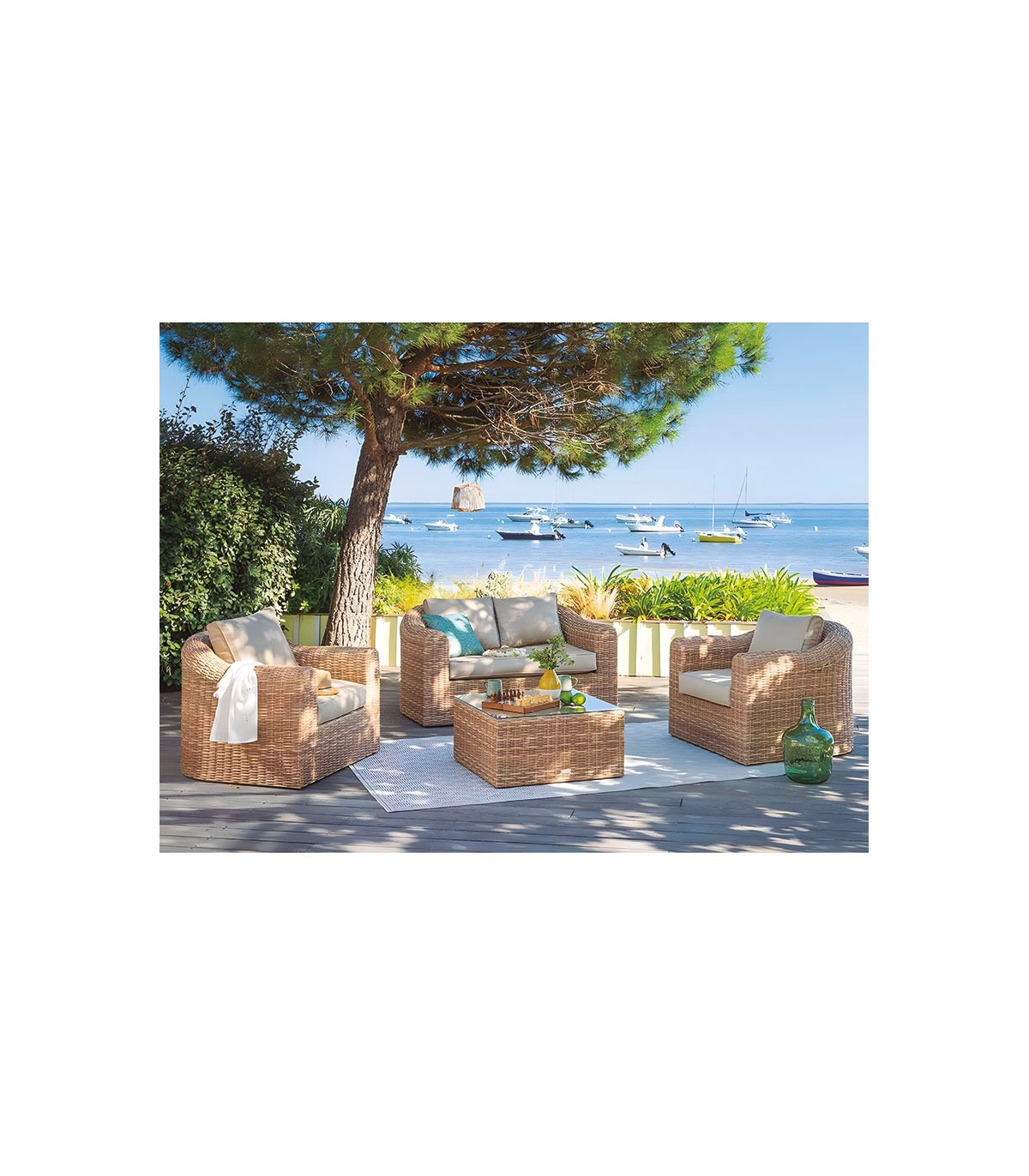 Estructura de acero y ratán sintético. Cojines de color beige..