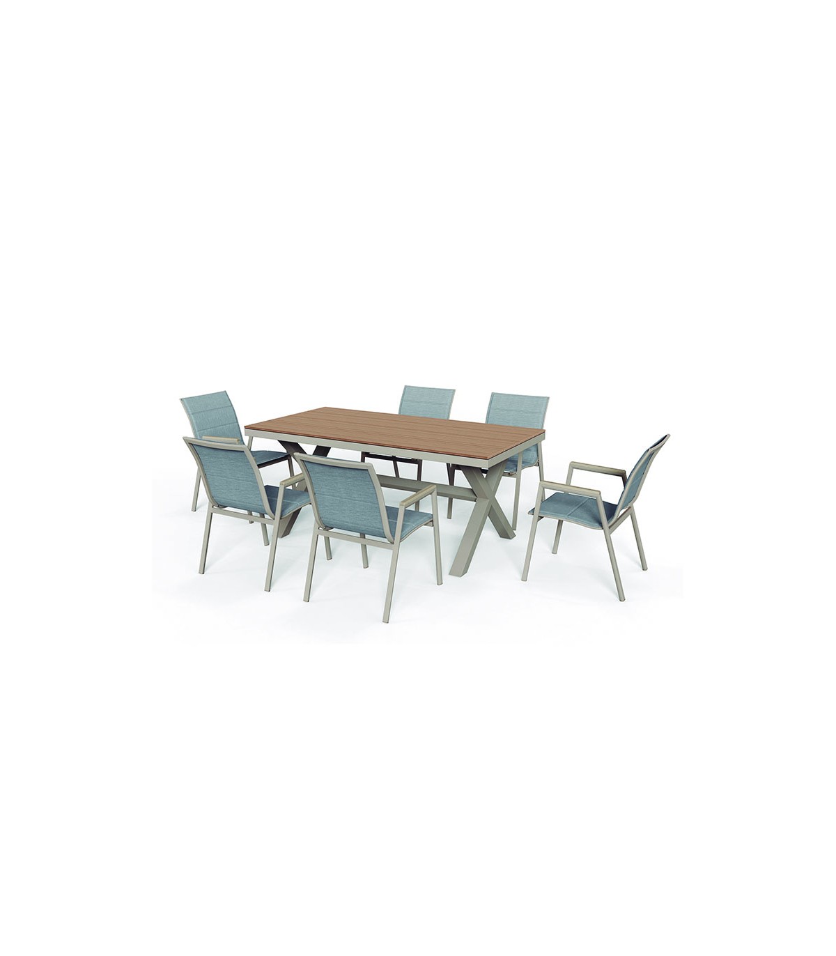 Siete piezas. Estructura Aluminio gris. Tope mesa y posabrazos polymadera. Tipo tela textilene gris.