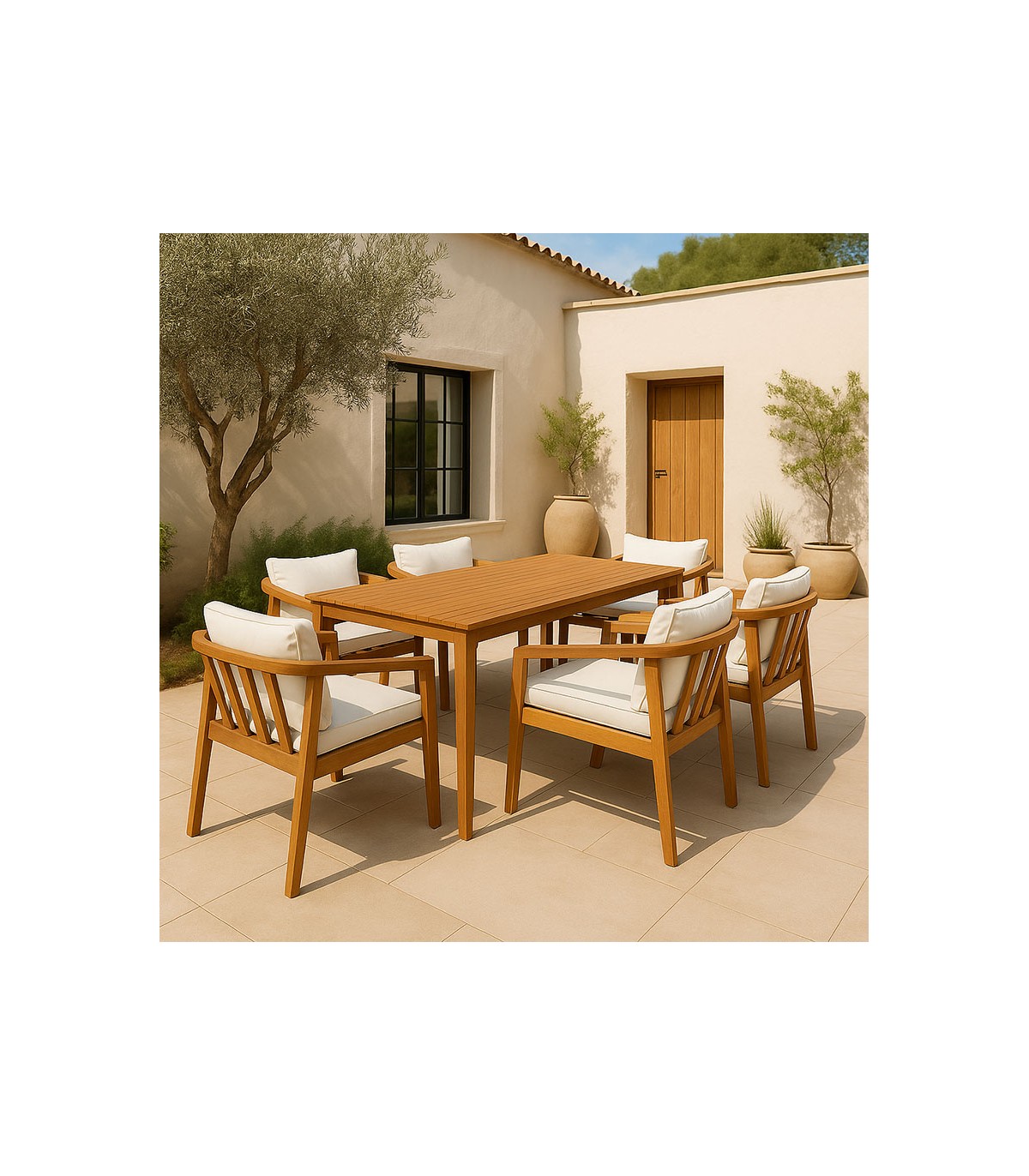 Estructura madera. Tipo tela poliéster color crudo. Cojines desenfundables.