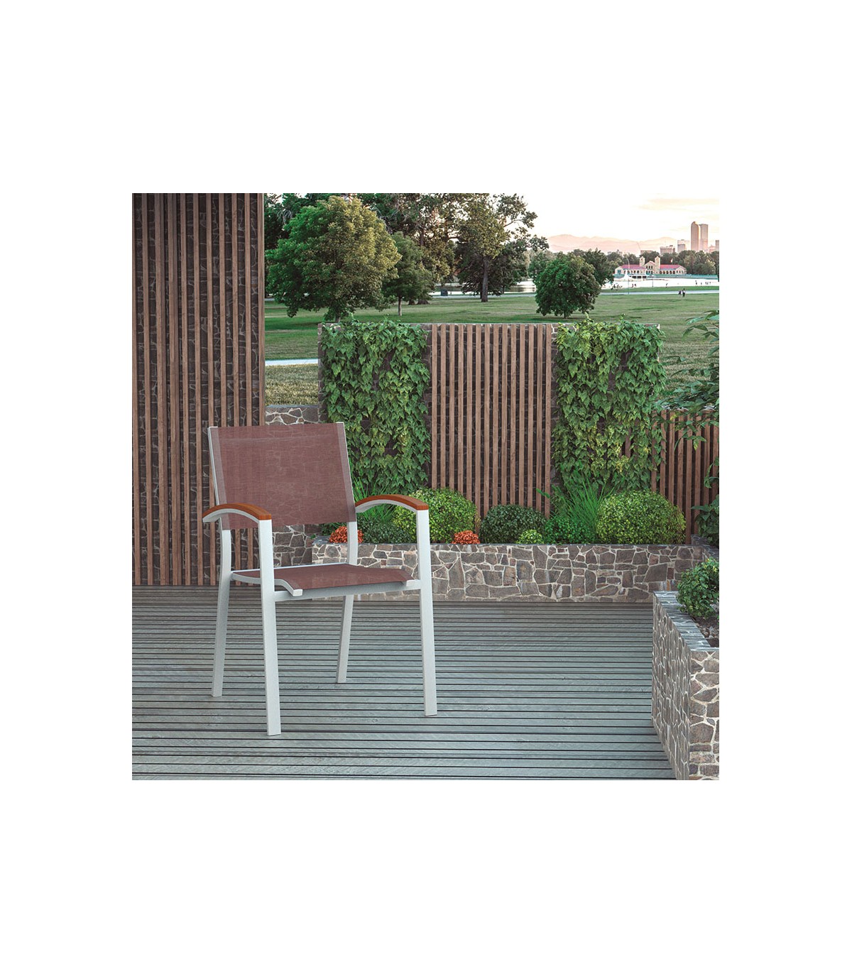 Estructura de aluminio lacado blanco, Sillas con respaldo textilene y reposabrazos en madera de eucalipto natural.