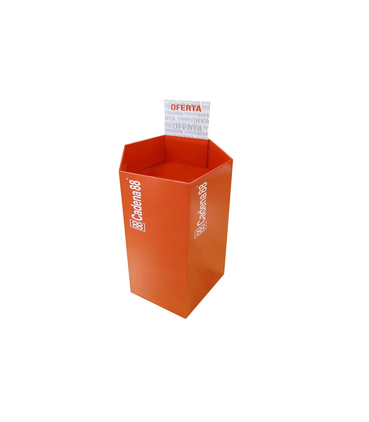 Fabricado en cartón de color rojo. Dispone de cartela para identificar el producto. Contenedor de 24 cm de profundidad para ubicar diferentes tipos de producto. Embalaje unitario.