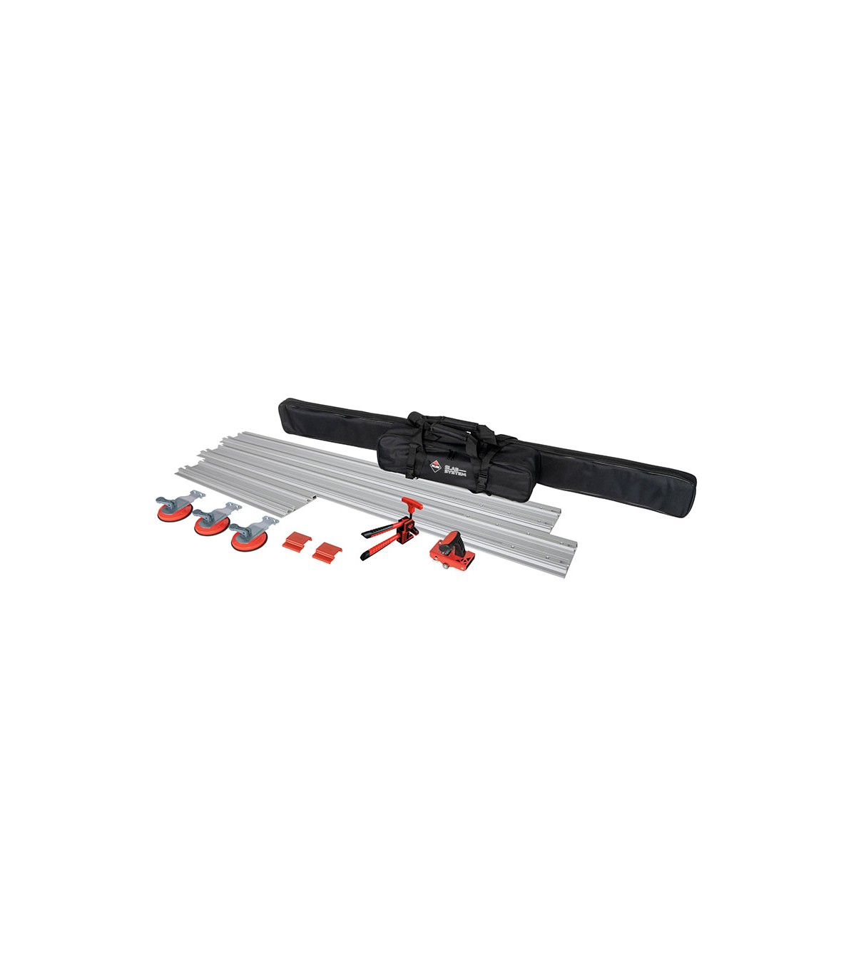 Sistema de corte manual de lámina porcelánica de gran formato y espesores comprendidos entre 3 y 8 mm. 2 guías de aluminio extrusionado de 155 cm y una de 65 cm de longitud y conectables entre sí. Capacidad de corte de 360 cm (ampliable según necesidad añadiendo guías extras). Incluye 3 ventosas de caucho natural para una mejor fijación. Carro marcador con rulina de ø 22 mm. Tenaza regulable con mango soft-grip. Llave allen para montaje. Bolsa de transporte.