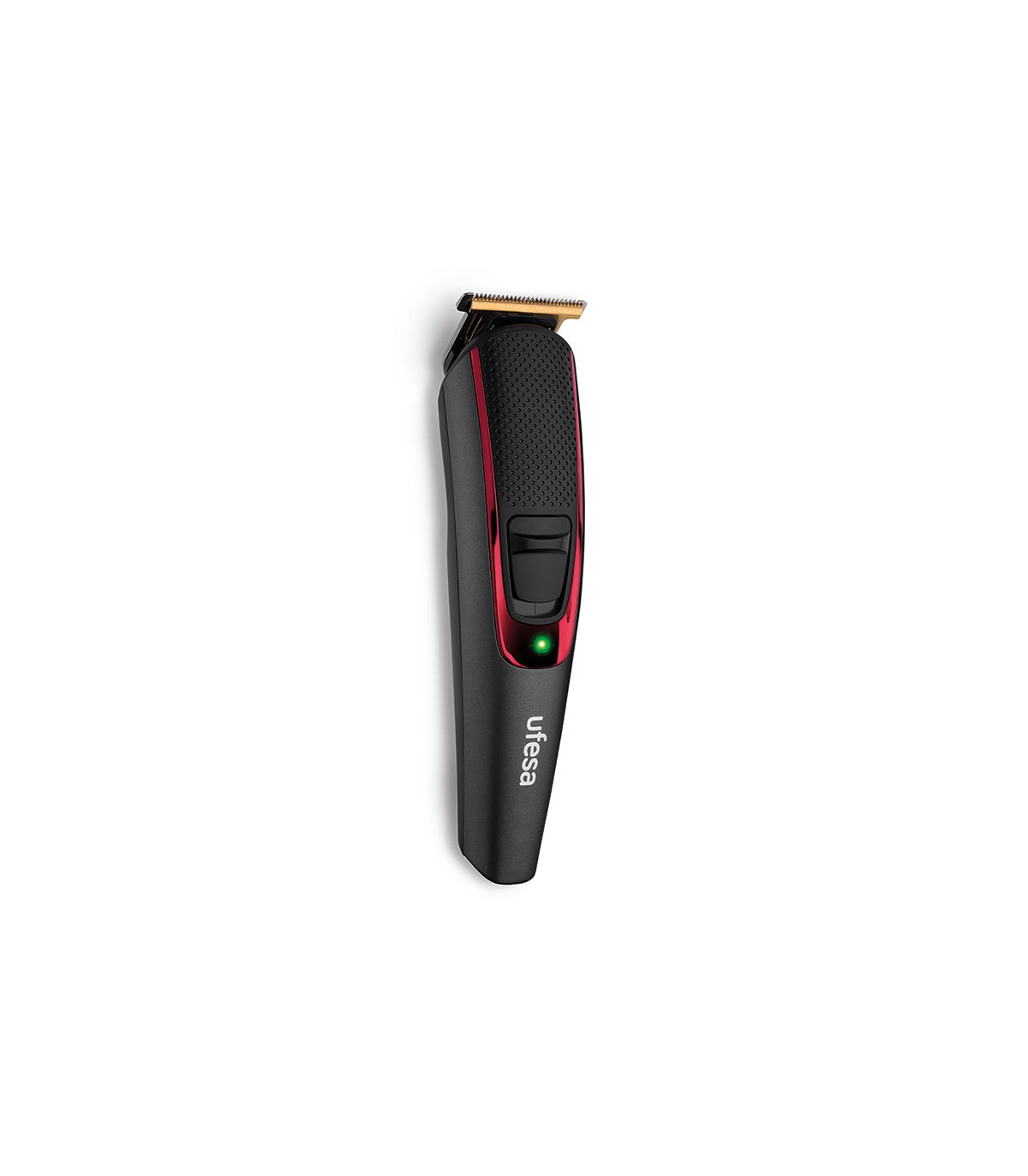 Cuchillas con reversimiento titanio fotma T de 38 mm. Batería llitio larga duración. Tiempo carga 2 horas. Cabezales extraíbles y lavables. Recortador facial para nariz y orejas. Cabezal mini afeitadora y de precisión. Peine ajustable de 3-10 mm. 4 peines fijos 12/15/18/21. 13 longitudes corte. Indicador Led carga. Uso con/sin cable. Bolsa almacenaje.