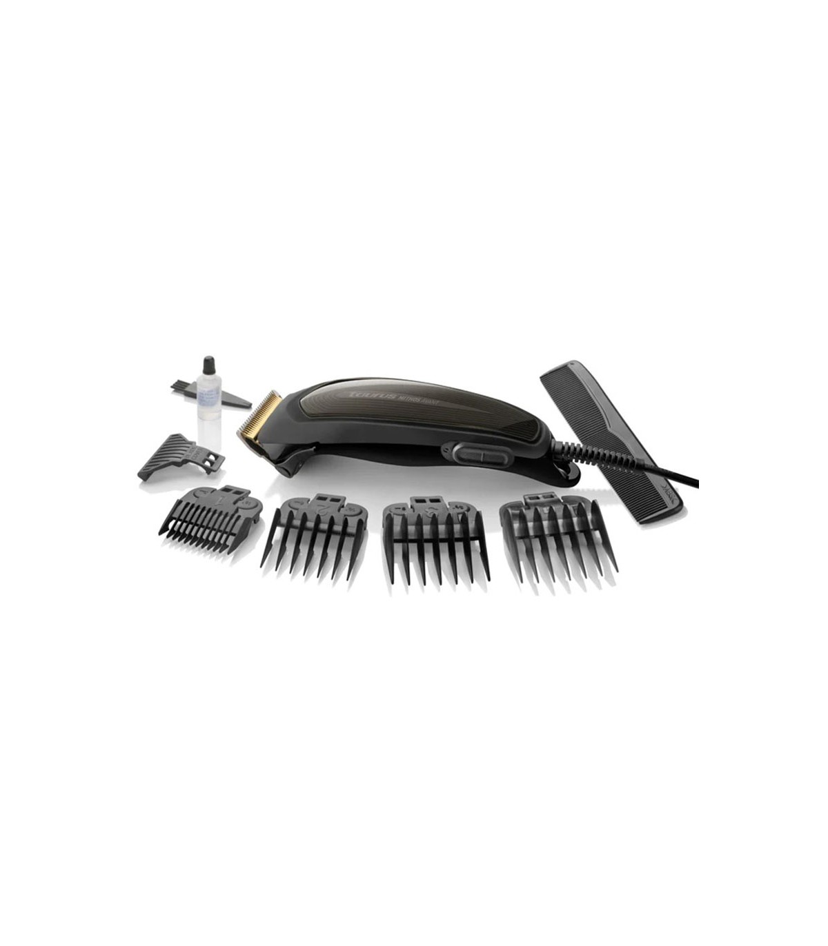 Máquina profesional con cable. Cuchillas de titanio ultra afiladas, incluye 4 peines guía extraíbles de 3, 6, 9, 12 mm, cepillo de limpieza, aceite lubricante y protector para cuchillas.
