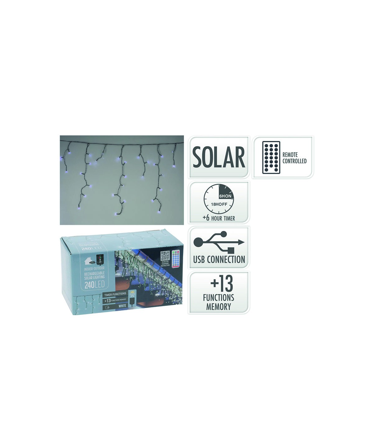 Luz solar recargable. Cable de alimentación (leadwire): 300 cm. Bombilla de 5 mm.. Longitud total de las luces: 780 cm. Tiempo de carga: 6 h. Tiempo de iluminación: 40 h.. 13 Funciones y función temporizador. Carga por USB (cable incluido). Mando a distancia incluido, 1 × batería CR2025. Medidas: 180 × 100 × 103 mm.