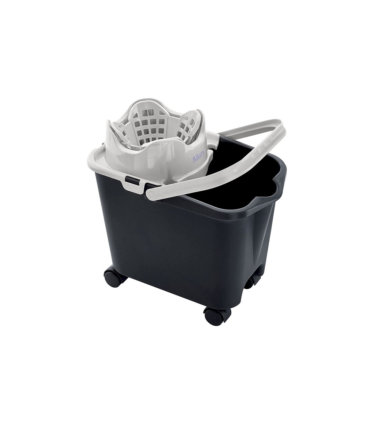 Escurre sin esfuerzo gracias a su sistema de muelle. Amplio escurridor para todo tipo de fregonas. Sujeción para el palo. Ruedas giratorias para facilitar el transporte. Color gris.