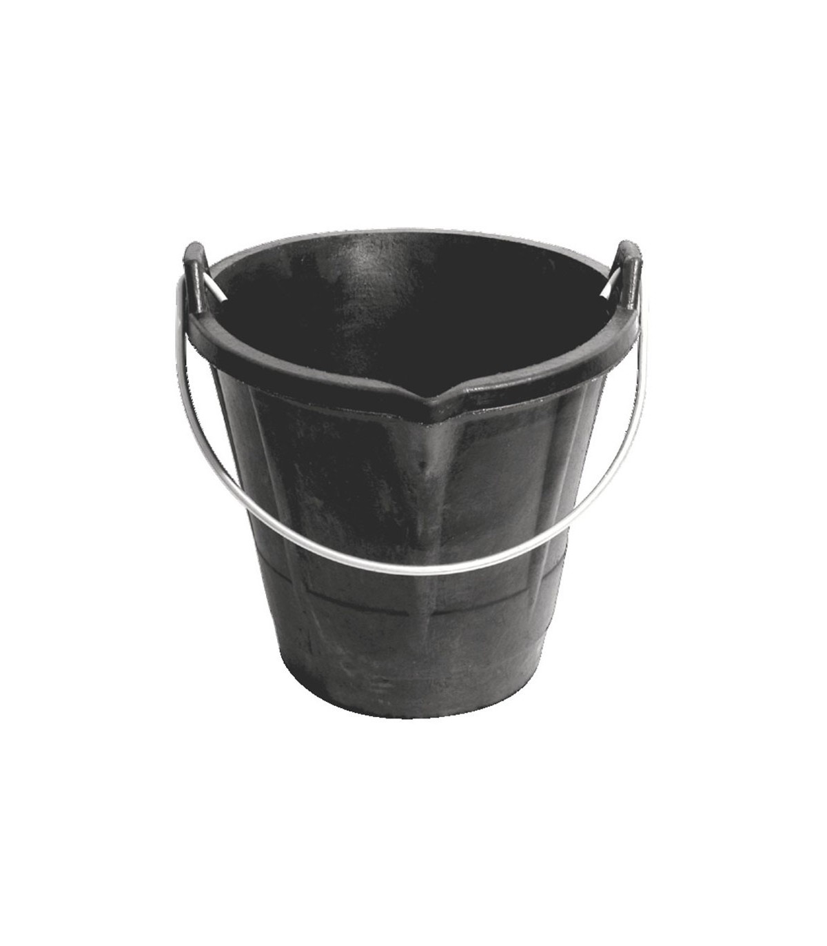 Caucho natural reforzado con fibras textiles (mayor resistencia a la abrasión). Fondo exterior nervado para facilitar el agarre. Con pico. Color negro. Asa metálica ø 6,3 mm.