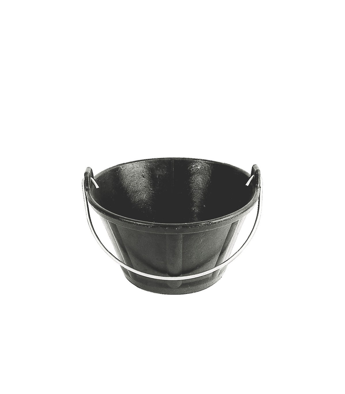 Caucho natural reforzado por fibras textiles (mayor resistencia a la abrasión). Escala graduada moldeada en la masa. Fondo exterior nervado para facilitar el agarre. Color negro. Asa metálica ø 6,3 mm.